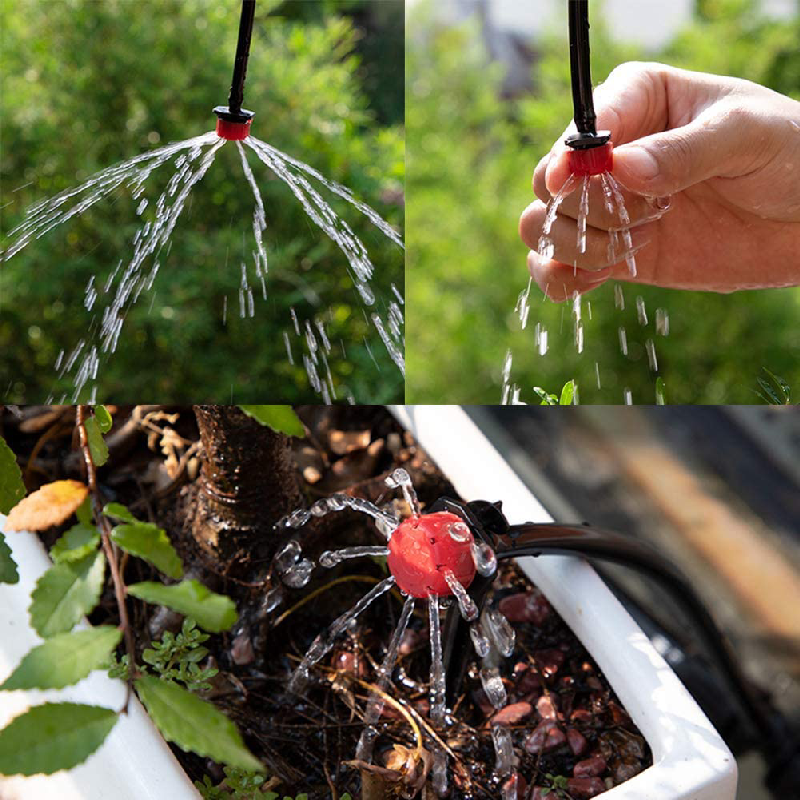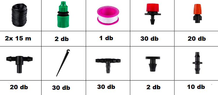 A 147 darabos Csepegtető és Öntöző Rendszer jellemzői: - Könnyen telepíthető, szakértelem nélkül - Választható adagolási lehetőségek - Egyszerű szabályozhatóság - Tömlő hossza: 30 méter (2x15 méter) - Üzemi nyomás: 4-6 bar A csomag tartalma: - 2 db 15 méteres cső (belső átmérő: 4 mm, külső átmérő: 6 mm) - 2 db gyors cső csatlakozó - 1 db teflon ragasztószalag - 30 db piros csepegtető - 20 db köd szórófej - 20 db „T” alakú elosztó/csatlakozó - 30 db rögzítő kampó - 30 db 3 irányú csatlakozó - 2 db elzáró fedő/kupak - 10 db egyenes csatlakozó