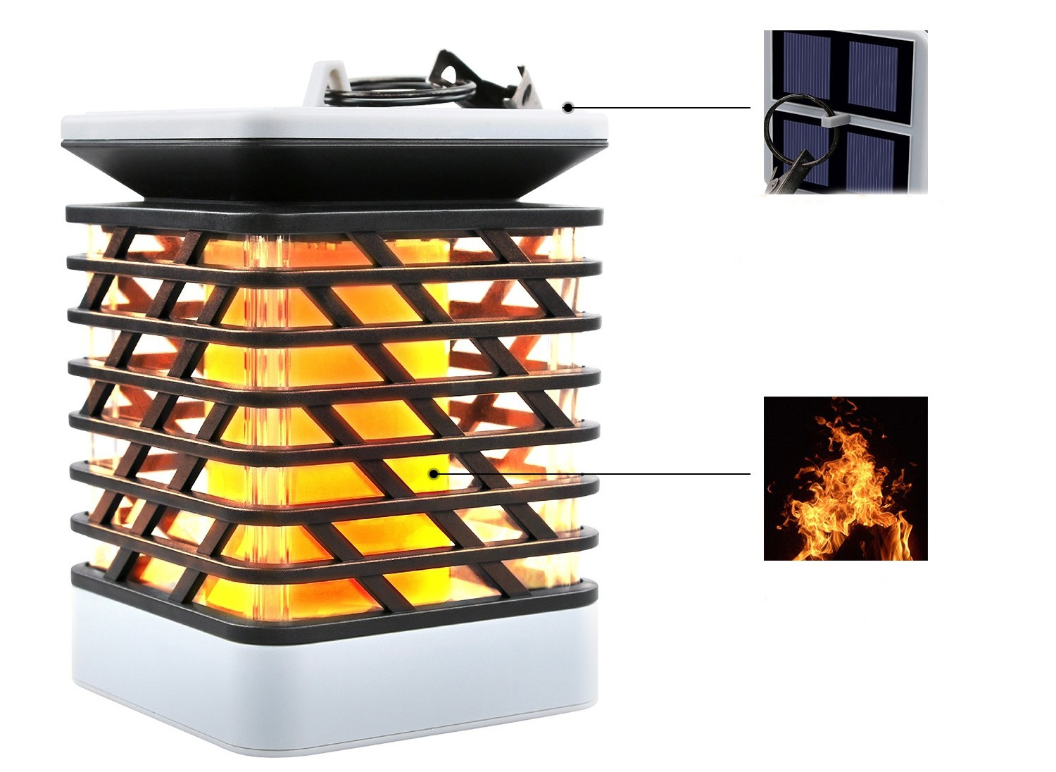 A beépített 1500 mAh akkumulátora teljes napsütés esetén 4-6 óra alatt feltöltődik a beépített napelem panelről, mely után akár 10-12 órán keresztül a valódi lángokat megszégyenítő módon táncol és világít.