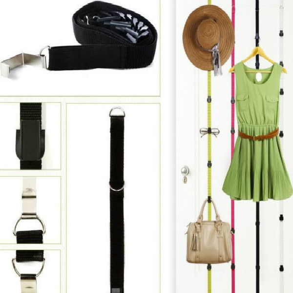 Így használd: 1. Akaszd a kampókat a pánt két végén található karikákba. 2. Az egyik végét az ajtó aljára, a másikat a tetejére akaszd be, hogy kifeszüljön. 3. Állítsd be a neked tetsző távolságokat az akasztókon, és már rá is teheted, amit szeretnél.