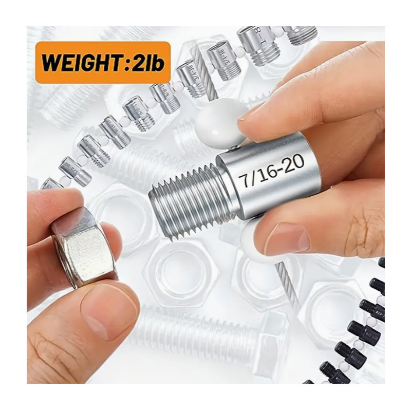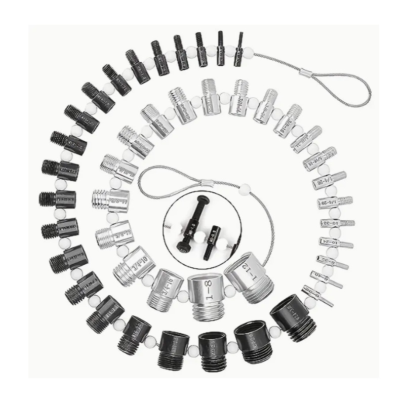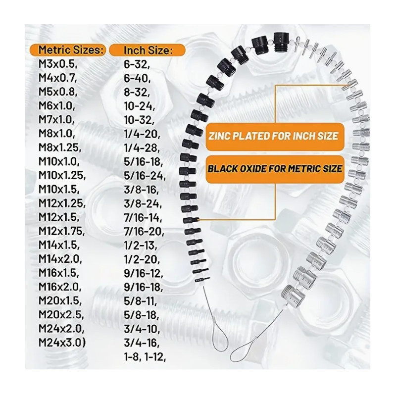 Tartalmazott hüvelykes méretek: 6-32, 6-40, 8-32, 10-24, 10-32, 1/4-20, 1/4-28, 5/16-18, 5/16-24, 3/ 8-16, 03/8-24, 7/16-14, 7/16-20, 1/2-13, 1/2-20, 9/16-12, 9/16-18, 5/8- 11, 5/8-18, 3/4-10, 3/4-16, 1-8, 1-12.