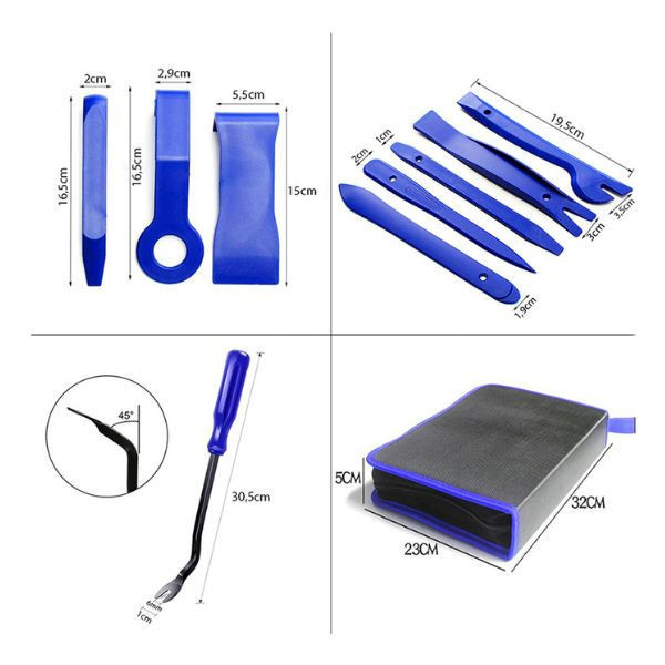 Speciális készletünk alkalmas kárpitok, kapcsok szétszereléséhez, továbbá autórádiók, reteszekkel ellátott elektronikus berendezések eltávolításához is. A kárpitlehúzók erős műanyagból készültek, aminek köszönhetően munkavégzés közben nem karcolják meg az autó berendezéseit.