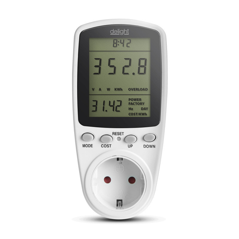 Ez a fogyasztásmérő készülék segít Önnek a költségek minimalizálásában és egy energiatakarékos otthon kialakításában. Méri a feszültséget, az áramerősséget, frekvenciát, teljesítményt, és ezek alapján kiszámolja az energiafogyasztást. Túlterhelés esetén a készülék azonnal figyelmeztető hangot ad. A készülék előre betáplált egységárak alapján képes a teljes költség meghatározására.