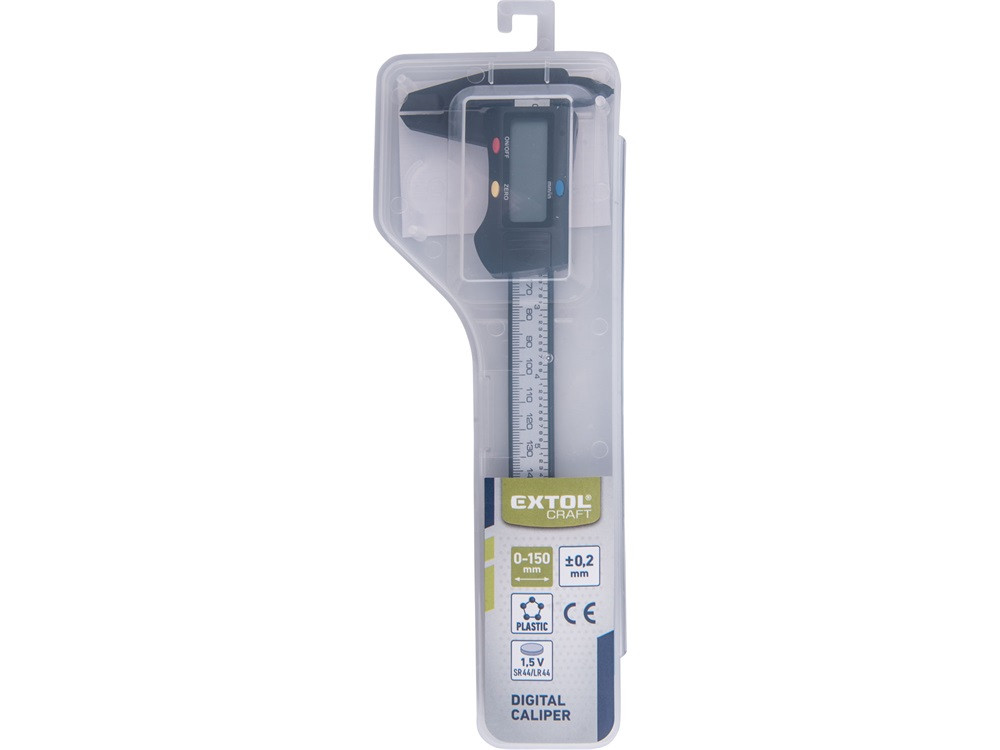 EXTOL CRAFT digitális tolómérő; 0,01×150mm, mélységmérővel, műanyag, pontosság ±0,2 mm