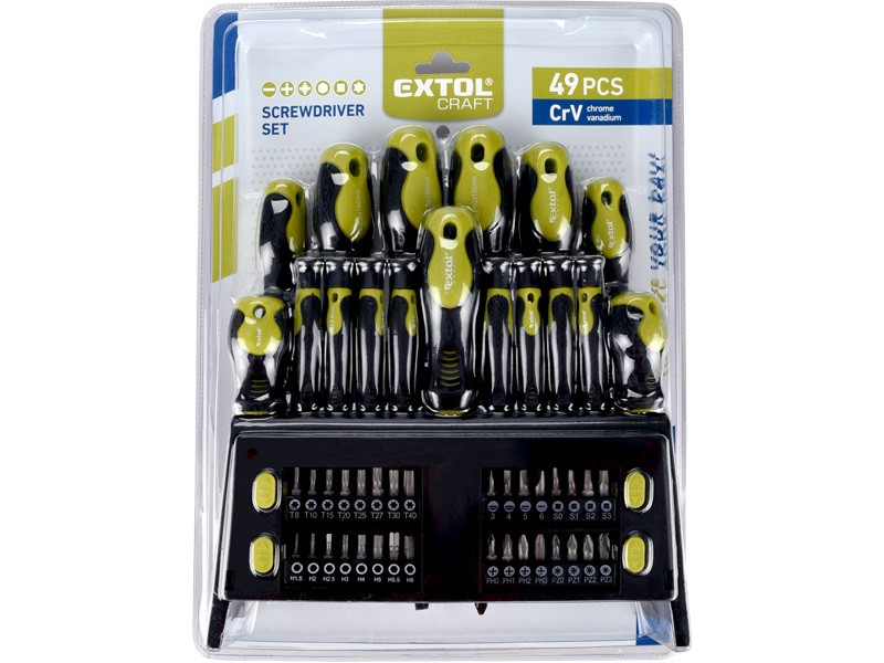 EXTOL CRAFT csavarhúzó klt. 49 db, CrV, mágneses, 4db lapos + 4 db PH + 8 db órás csavarhúzó + BIT-ek, műa. tartóállvány, bliszt