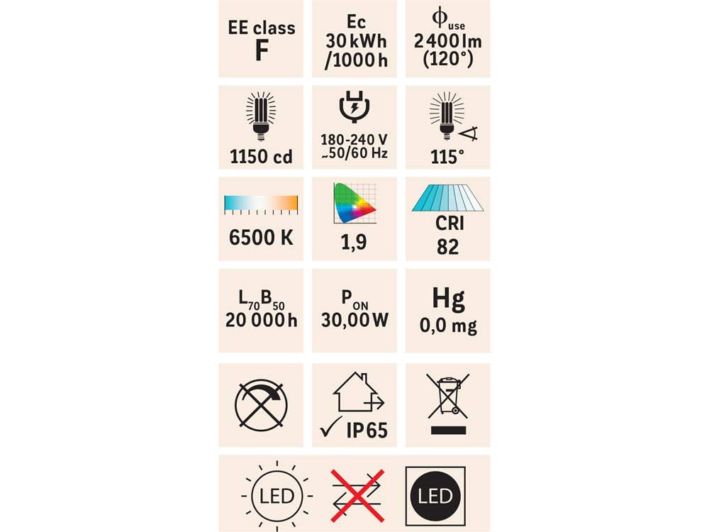 30W, megfelel kb. 260W hagyományos izzó fényerejének
