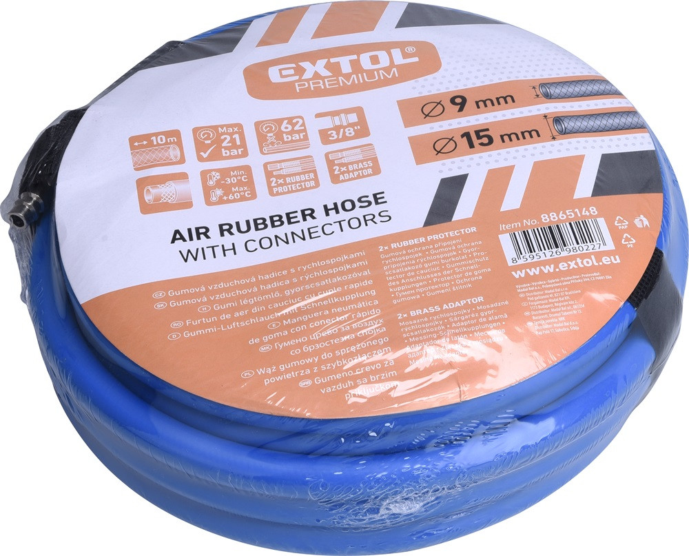 EXTOL PREMIUM légtömlő egyenes, 10m, kompresszorhoz, 3/8, átm.: 9 / 15 mm, max. 20 Bar, gyorscsatlakozókkal
