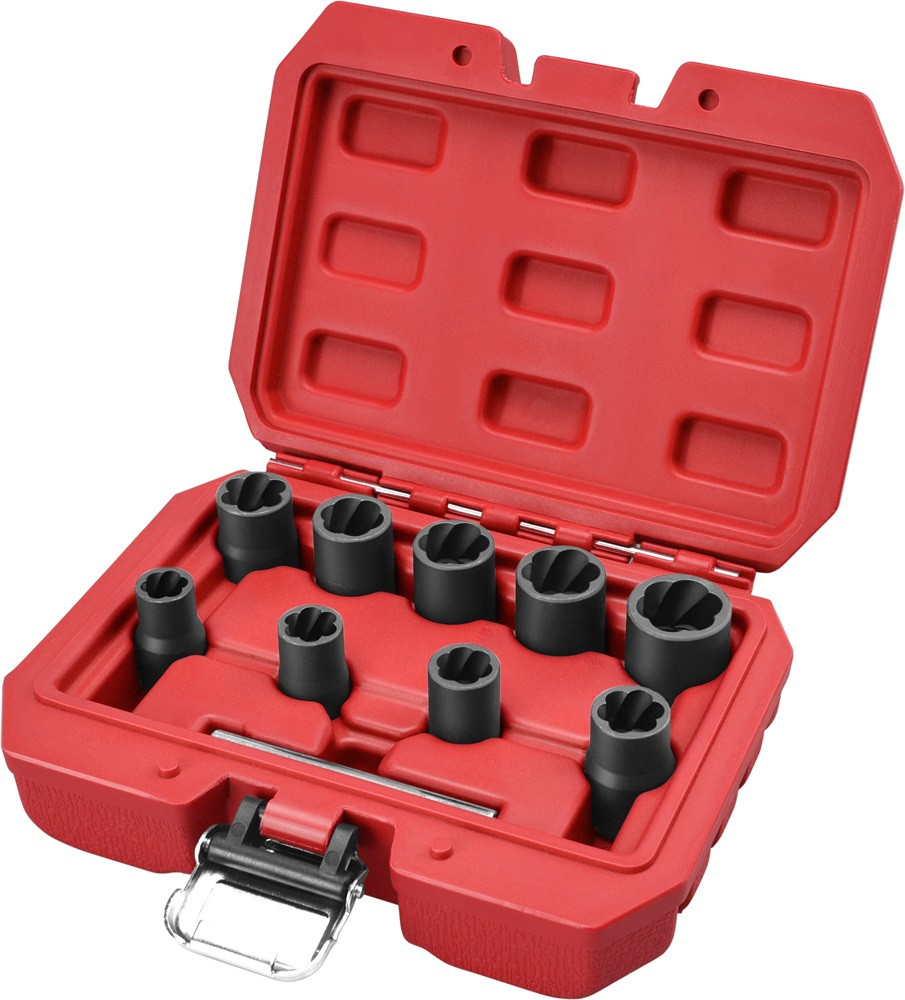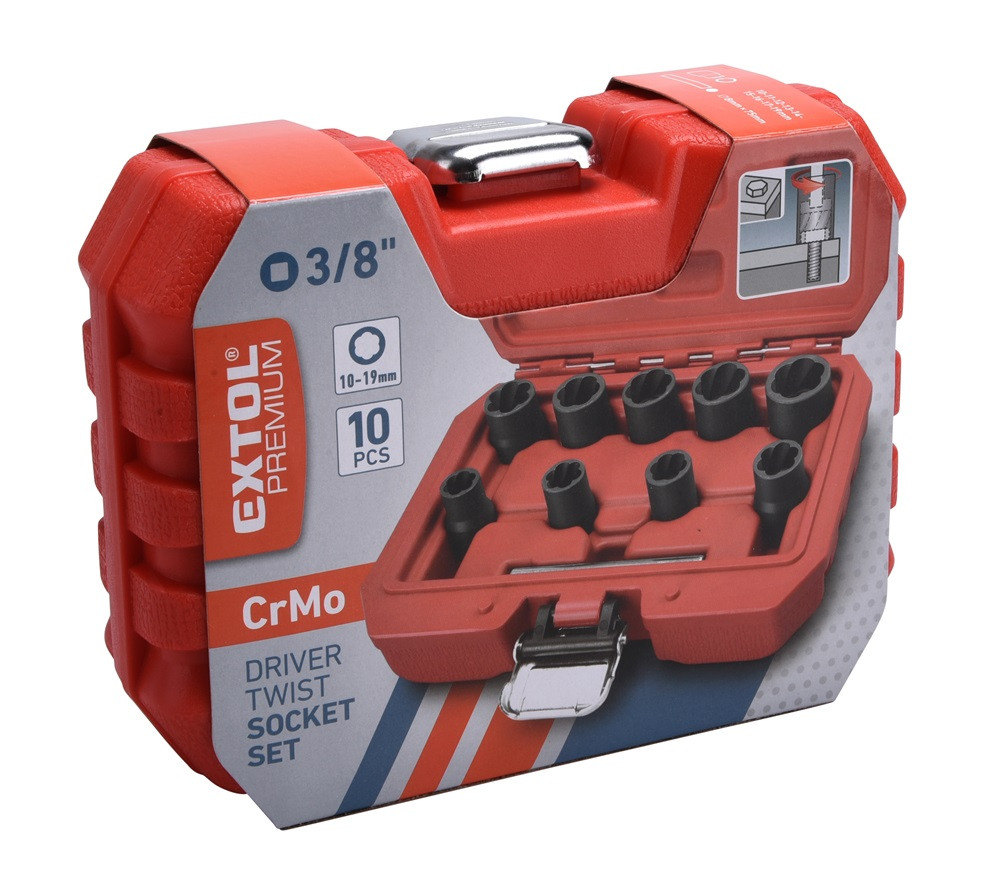 EXTOL PREMIUM csavarkiszedő klt. TWIST; 3/8' befogás, 9db fej: 10, 11, 12, 13, 14, 15, 16, 17, 19mm, 1 db kiütőrúd, CrMo, műanya