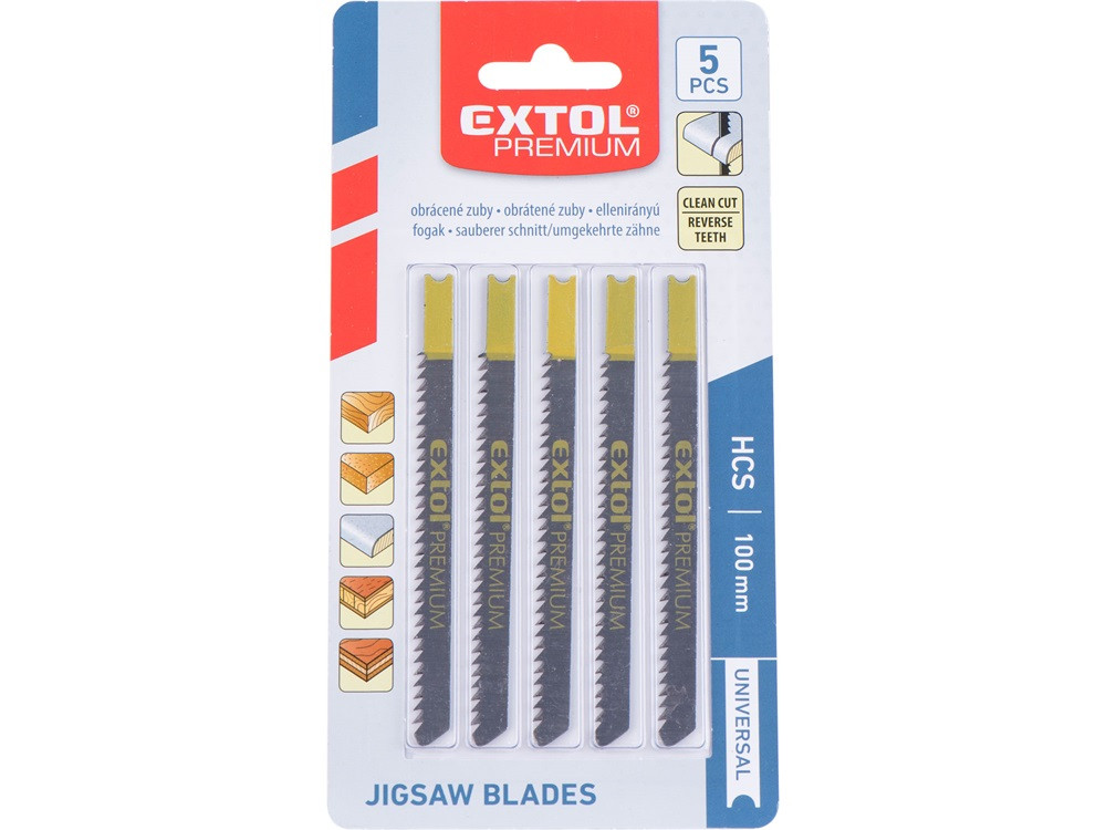 EXTOL PREMIUM dekopírlap, 5db, univerzális befogás, HCS; 75×8×1,5mm, 2,5mm fogtáv, köszörült, fordított állású fogak, egyenes vágás, p
