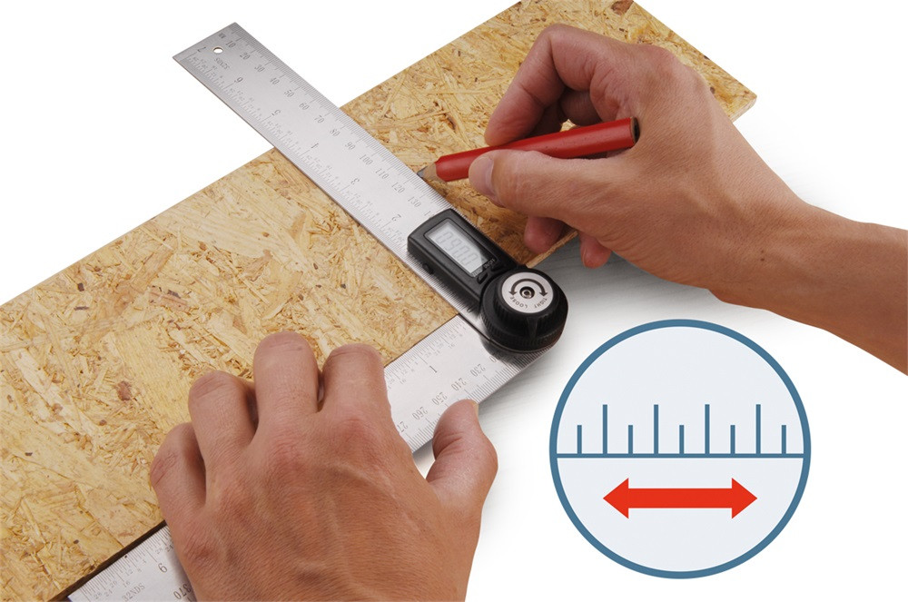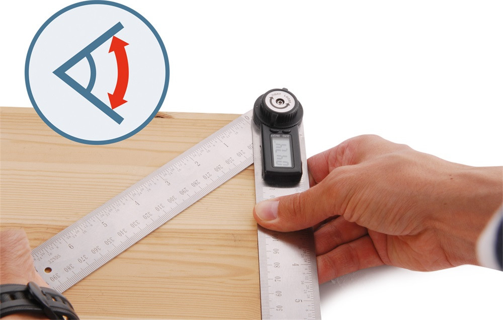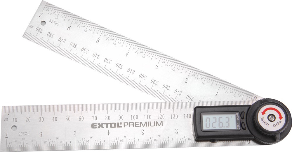 EXTOL PREMIUM digitális szögmérő-vonalzó, szög- és hosszmérésre, 0-360°, pontosság: ±0,3°, 2×200 mm, Alu szár mm és coll beosztá