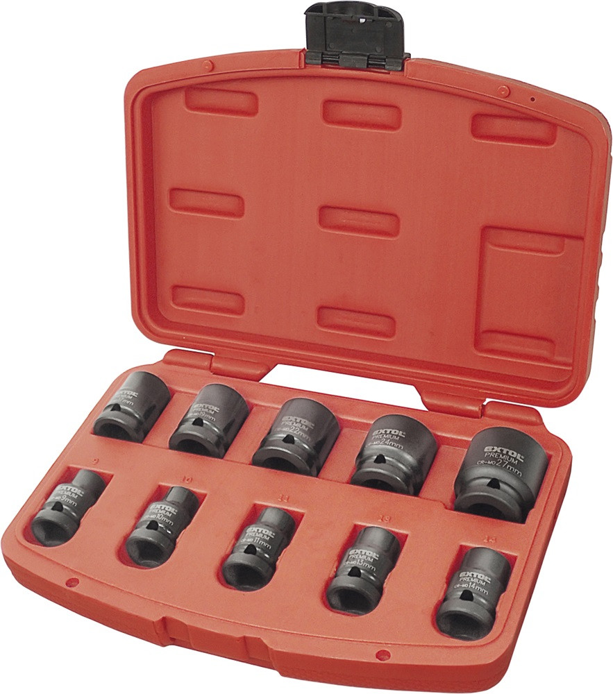 EXTOL PREMIUM gépi (impakt) dugófej klt. 1/2', 10db, 9-27mm × 37 mm ; feketített, műanyag tartóban
