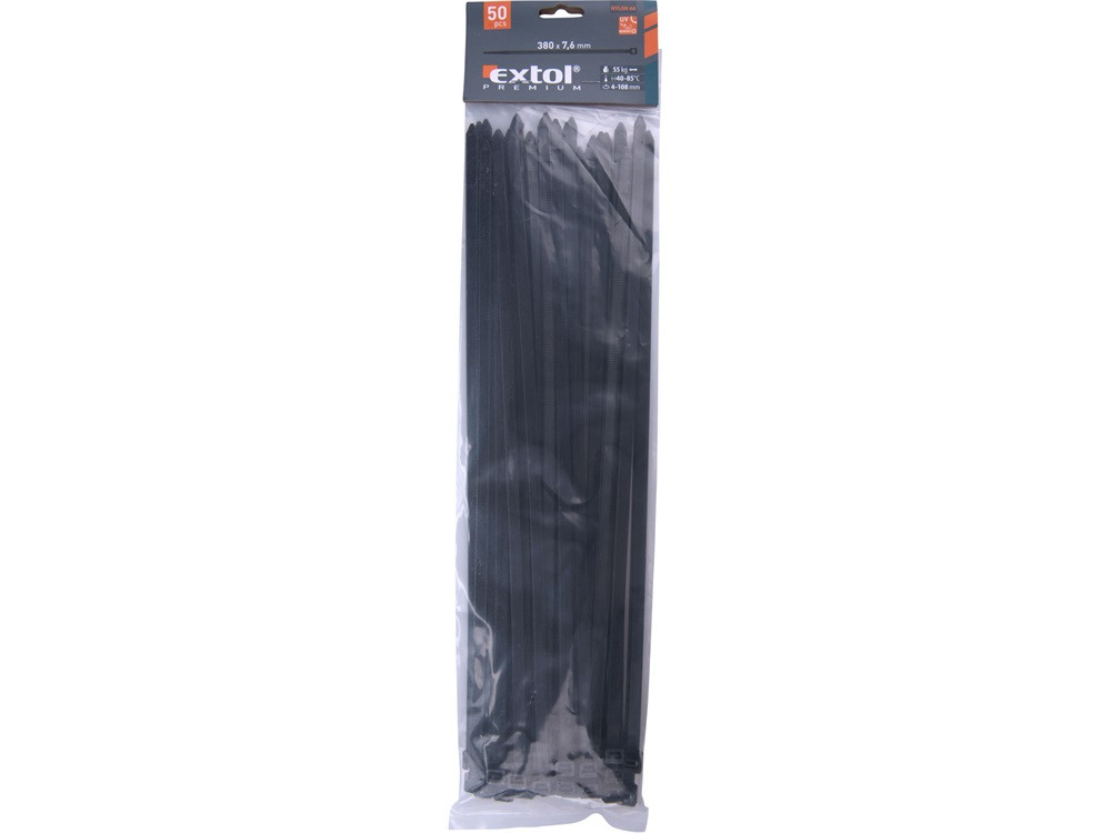 EXTOL PREMIUM kábelkötegelő 7,6×380mm 50db, fekete nylon; UV-, sav- és lúgálló