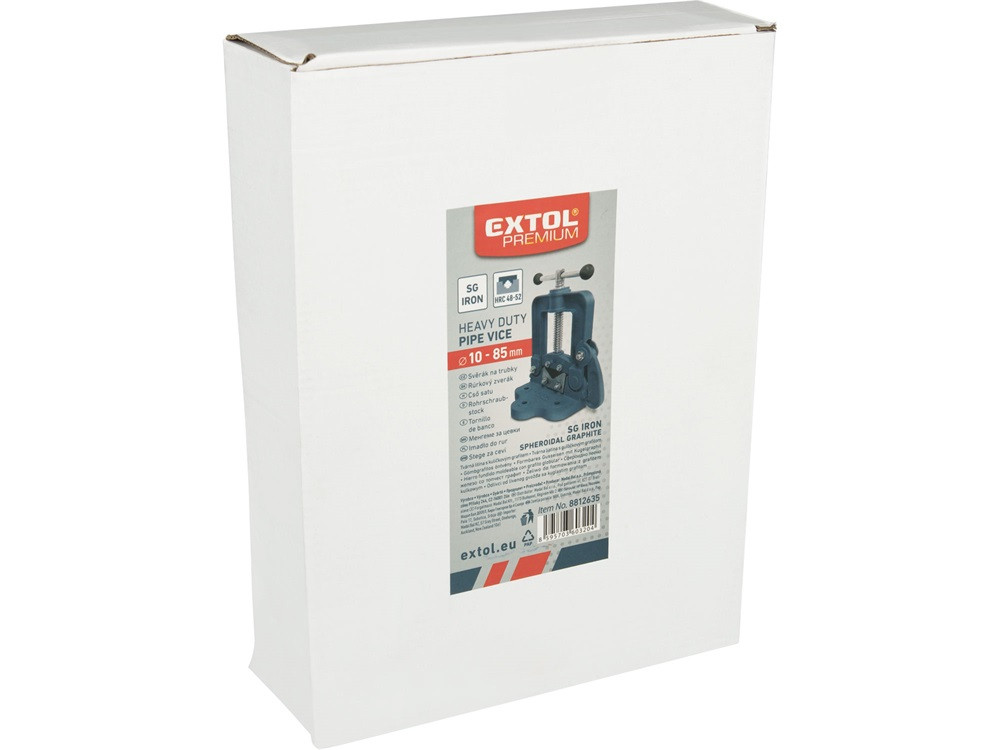 befogás: 10-85 mm, gömbgrafitos öntöttvas test, edzett acél pofák, pofák keménysége: HRC 48-52, talpon 3 lyuk: 12 mm csavarokkal rögzíthető (nem tartozék)