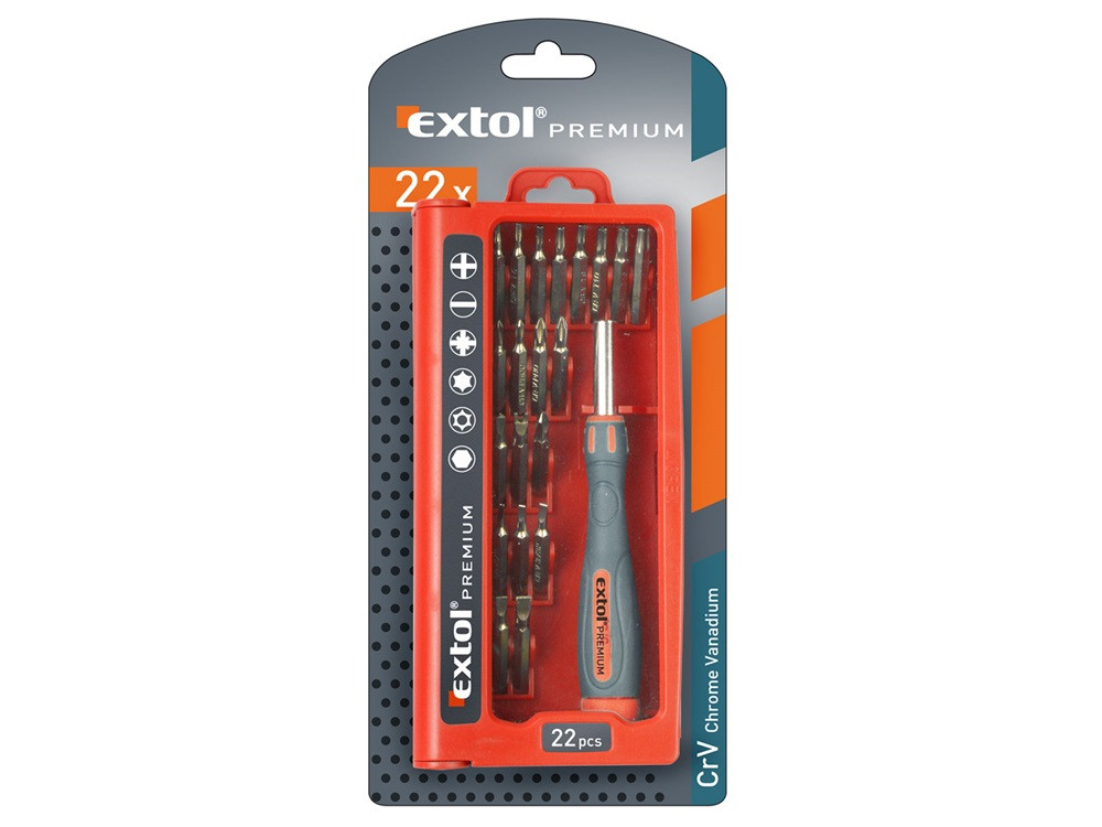 EXTOL PREMIUM órás csavarhúzó klt. 22 db C.V. bitekkel; lapos 1,5-3mm, PH000-PH1, PZ0-PZ1, imbusz: 1,5-3mm, torx: T6-20