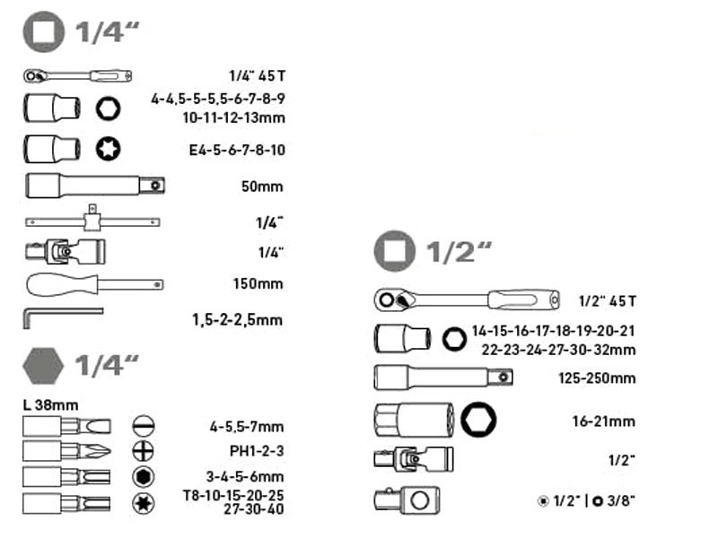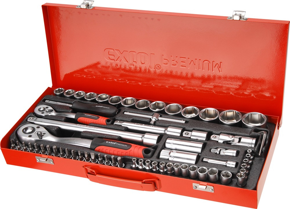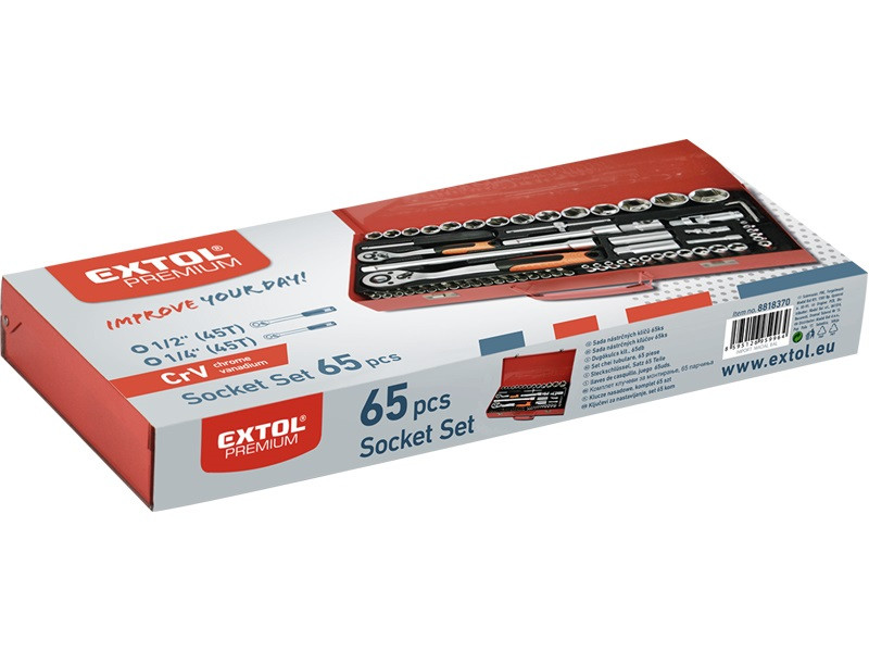EXTOL PREMIUM dugókulcs klt., CV., racsnis 45fog ; 1/4" és 1/2", 65db, dugófejek (4-32mm), bitek, fém doboz