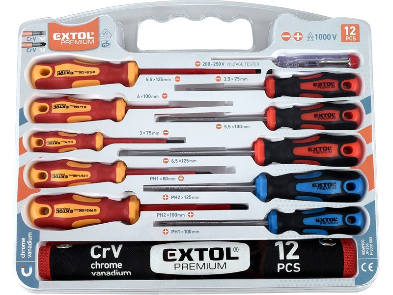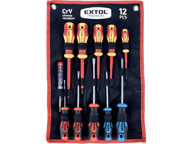 EXTOL PREMIUM csavarhúzó klt. szigetelt 1000V+nem szigetelt, 6+5db ; fáziskeresővel, műanyag kínáló+nylon tok