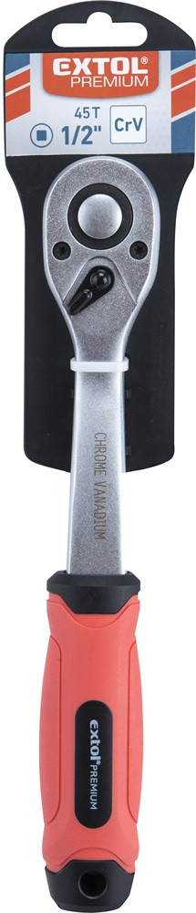 EXTOL PREMIUM racsnis hajtókar, CV., 45 fog, hajlított szár, csúszásgátló TPR markolat; 3/8', 208 mm