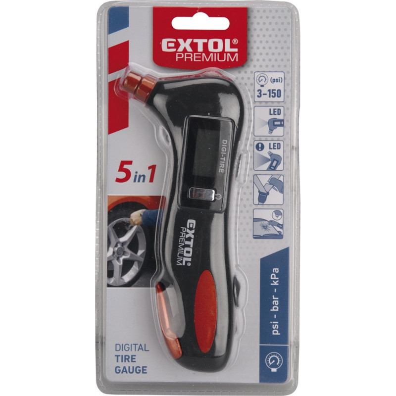 EXTOL PREMIUM nyomásmérő digitális, 5 az 1-ben autós funkció: nyomásmérő, fehér fény, vörös fény, üvegtörő, biztonsági öv átvágó