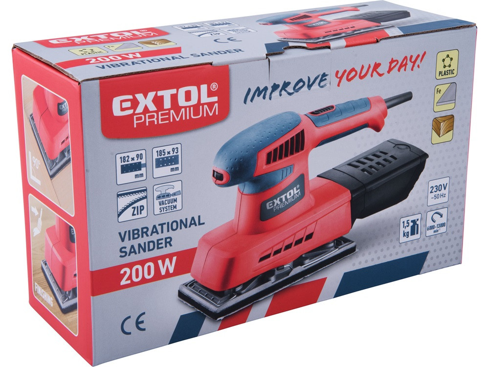 Hálózati feszültség: 230 V ~ 50 Hz Névleges teljesítményfelvétel: 200 W Rezgésszám terheletlen állapotban: 6.000 - 13.000 ford/perc Csiszolófelület mérete: 90 x 182 mm Használható csiszolópapír mérete 93 x 185 mm