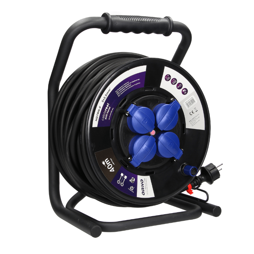 Egy innovatív kábeltekercs csavarodásgátló rendszerrel (fix aljzat), egyedi fém állvánnyal és túlterhelés elleni védelemmel (hőkapcsoló). Gumi, olajálló H07RN-F kábellel felszerelve, amely 42 méter hosszú. Négy schuko típusú földelt aljzattal rendelkezik, biztonsági zárókkal és tömítőfedéllel, így védve a portól, a szennyeződésektől és a víztől. Praktikus, gumi hordozófogantyújával könnyedén lehet mozgatni egyik helyről a másikra. Rendelkezik még forgódobos tekerőfogantyúval, orsóforgás-zárral és szigetelt IP 44 védelemmel ellátott dugasszal. Erős, bírja a külső hatást, így kiválóan alkalmazható kültéren is.