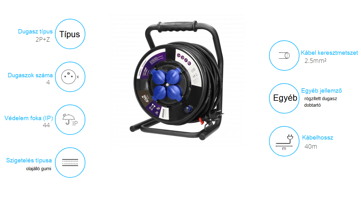 A termék tulajdonságai: A csatlakozóaljzat szabványa: schuko (F típus) Névleges feszültség: 230V~, 50Hz Max. terhelés/áram a feltekert vezetékhez: 1100W / 4,8A Aljzat típusa: 2P+Z Max. terhelés/áram a kihúzott vezetékhez: 3200W / 13,9A Aljzatok száma: 4 Védettségi fok (IP): 44 Biztonsági zárók: igen Vezetékek száma: 3 Szigetelés típusa: olajálló gumi USB töltő: nem Kábeltípus: H07RN-F Vezeték keresztmetszete: 2,5 mm² Egyéb jellemzők: dobállvány, rögzített dugaszok Hosszúság: 40m