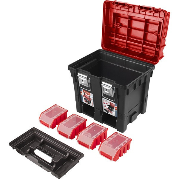Méret: 440×350×440mm Mit rejt a termék doboza? 1 darab szerszámos ládát, benne 1 darab tálcával és 4 darab műanyag tartóval.