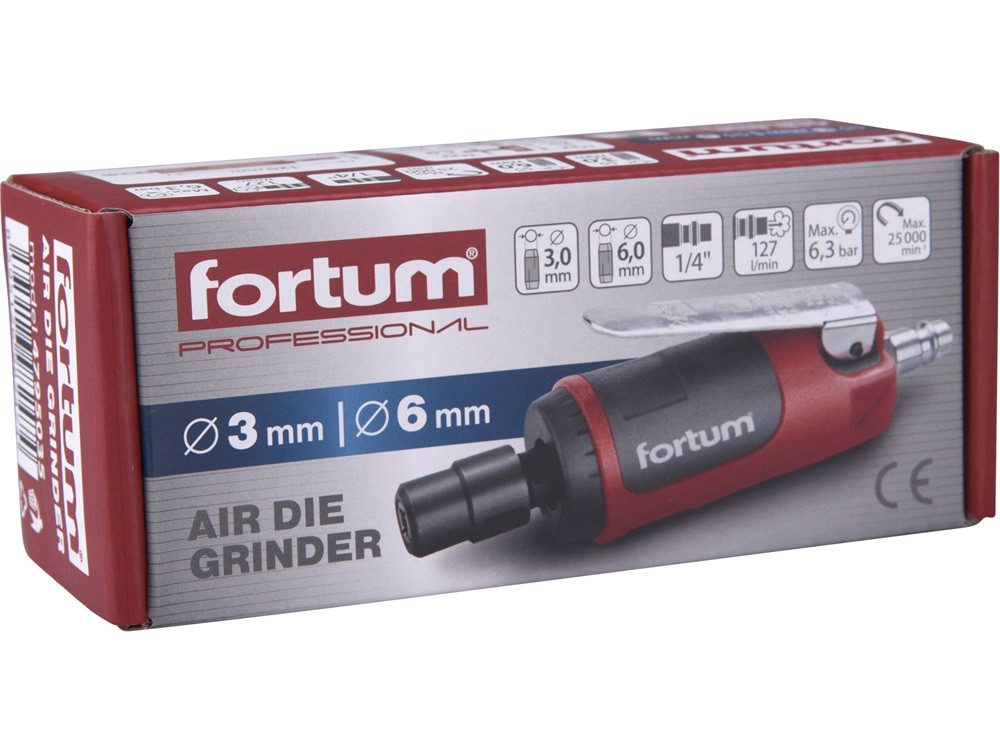 FORTUM pneumatikus furatköszörű, 125 mm hossz.,1/4'; (6 és 3 mm befogás), 25.000 1/min, 127 l/min, 6,3 Bar, 1/4' csatl., 0,36kg
