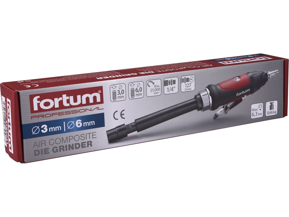 FORTUM pneumatikus furatköszörű, 295 mm hossz.,1/4'; (6 és 3 mm befogás), 25.000 1/min, 127 l/min, 6,3 Bar, 1/4' csatl., 0,7 kg