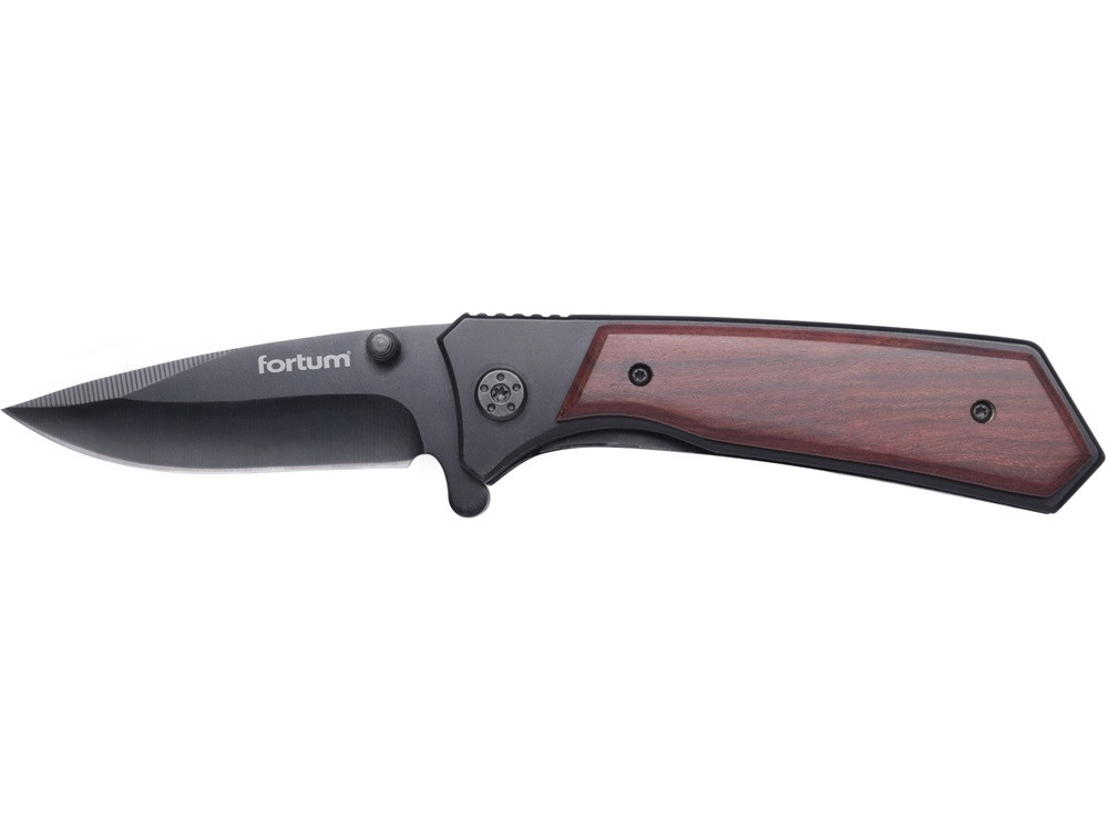 FORTUM zsebkés, rozsdamentes fekete pengével, teljes/összecsukott hossz:205/120mm, pakkafa nyél, övre akasztható, rögzítővel
