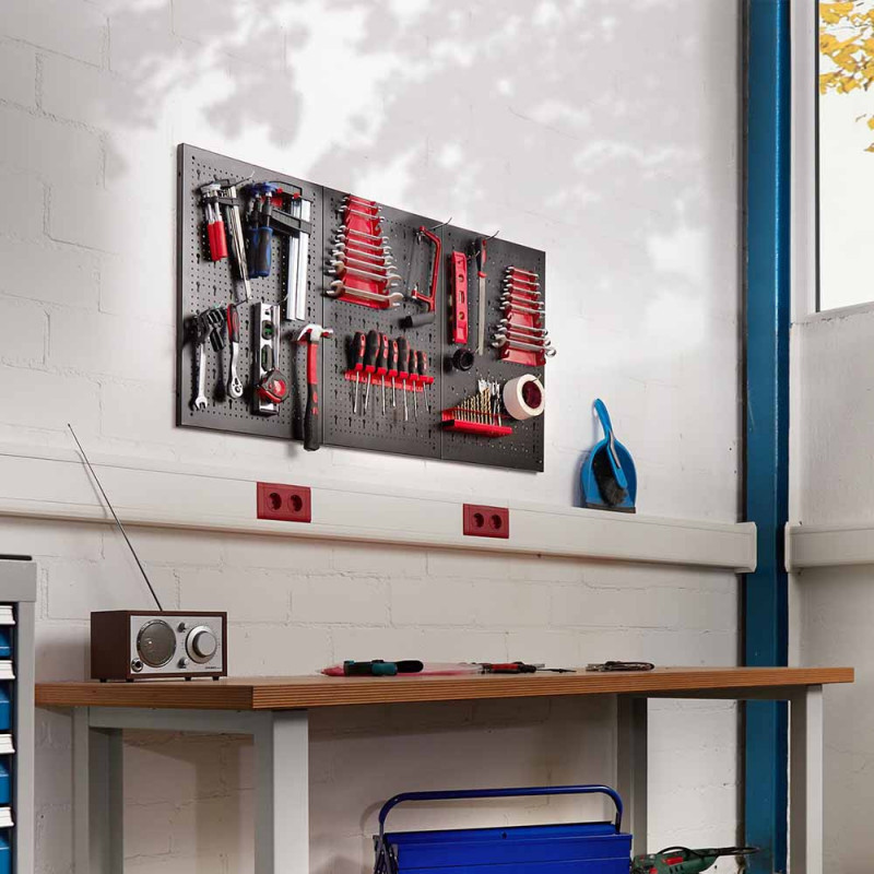 A szerszámos fal három részből áll, melyekre könnyedén, igényeidnek megfelelően felrakhatod a különböző méretű kampókat és rekeszeket, így alkalmas többek között csavarhúzók, fogók, fúrók, csavarkulcsok tárolására.
