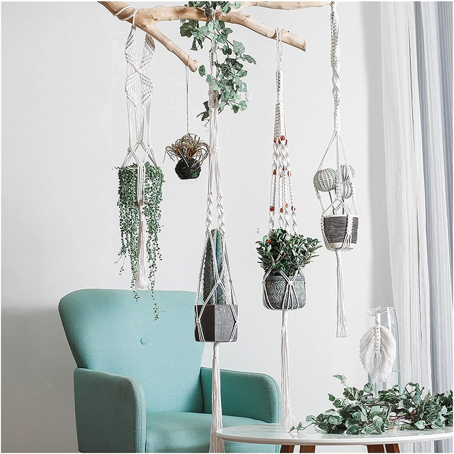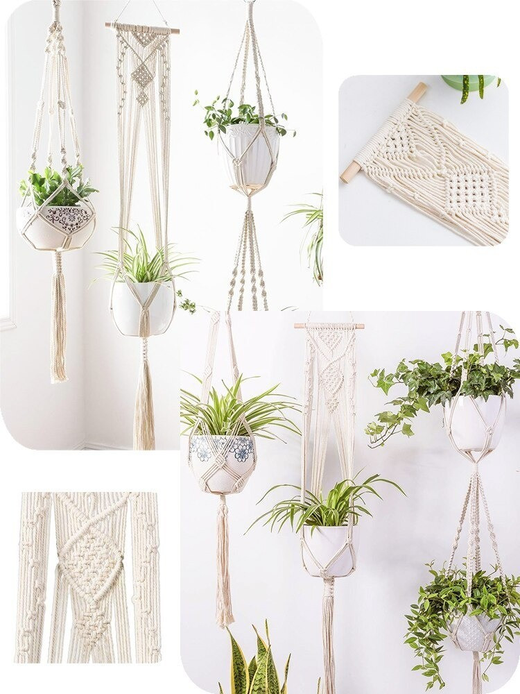 A függő virágtartók makramé, azaz csomózó technikával készültek, így látványos és egyedi kinézete van minden egyes darabnak.