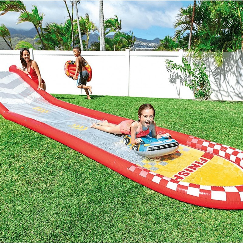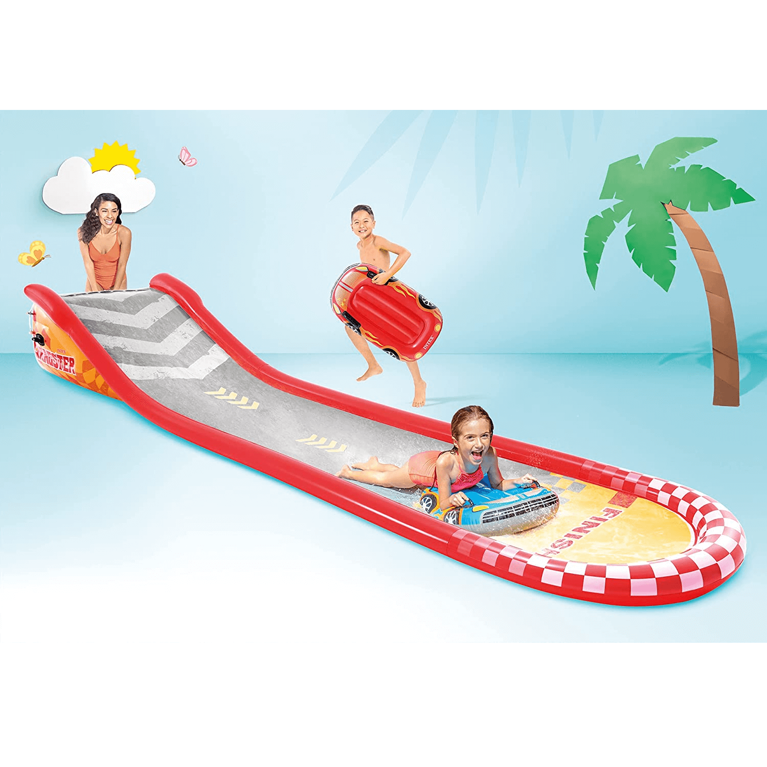 Versenyezz az idővel vagy akár mással ezen a vízzel lelocsolt, felfújható csúszdán. A termék úgy lett kialakítva, hogy kerti locsolóra kötve folyamatosan adagolja a vizet a csúszdára, így az nem szárad ki. A csomag tartalma még 2 felfújható gumimatrac is, amivel gyorsulva lecsúszhatsz. Kihagyhatatlan élmény és garantált szórakozás vár rád a csúszda használata közben.