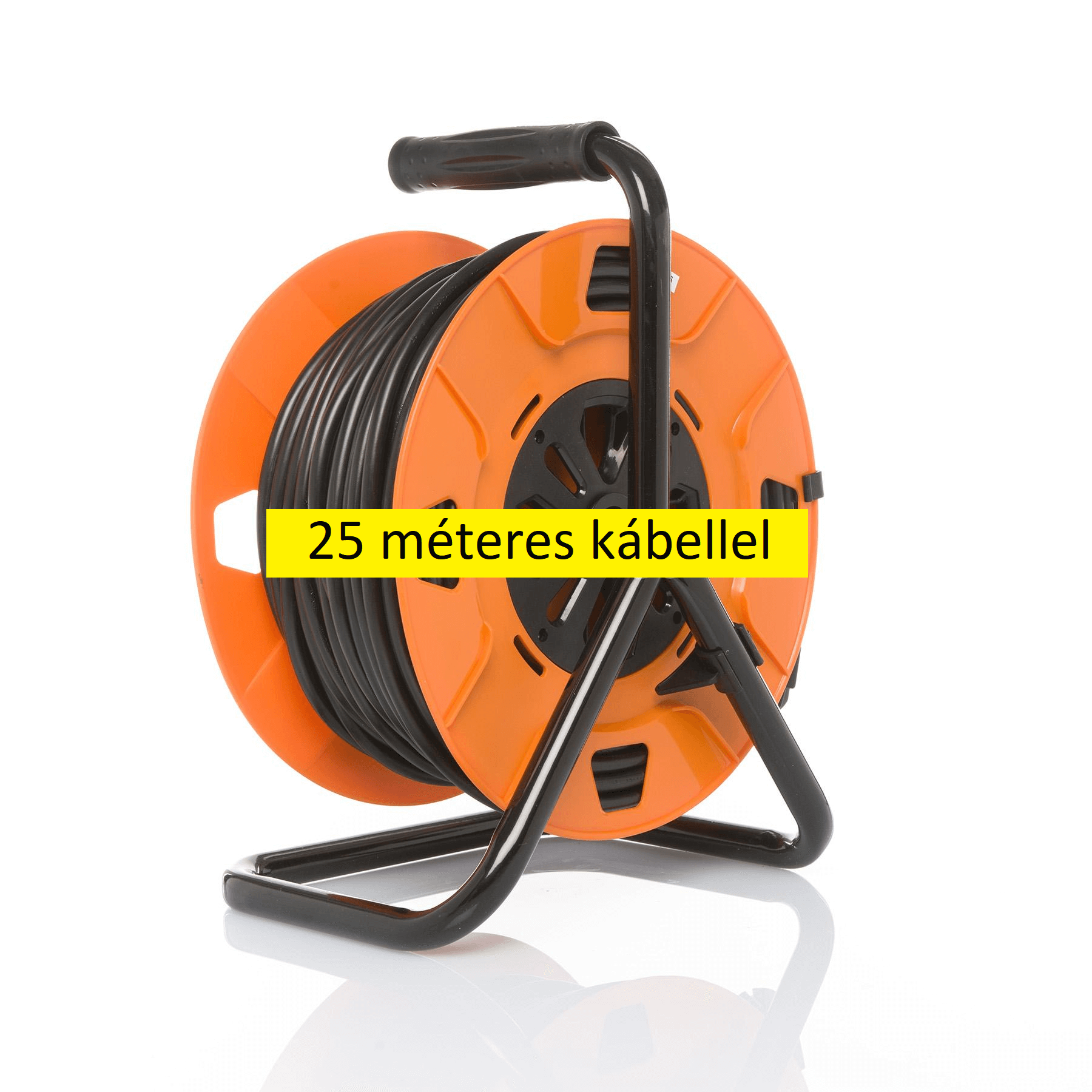 a ház körül és otthonában. A termék masszív fém talppal és 25 m hosszú H05VV-F 3G1,0 mm2 kábellel ellátott, melynek a végén pipa alakú dugó található. Az IP 20 védelem és a túlmelegedés elleni védőkapcsoló további védelmet nyújt használat során. A kábeldob 4 db 250 V-os védőérintkezős aljzattal ellátott.