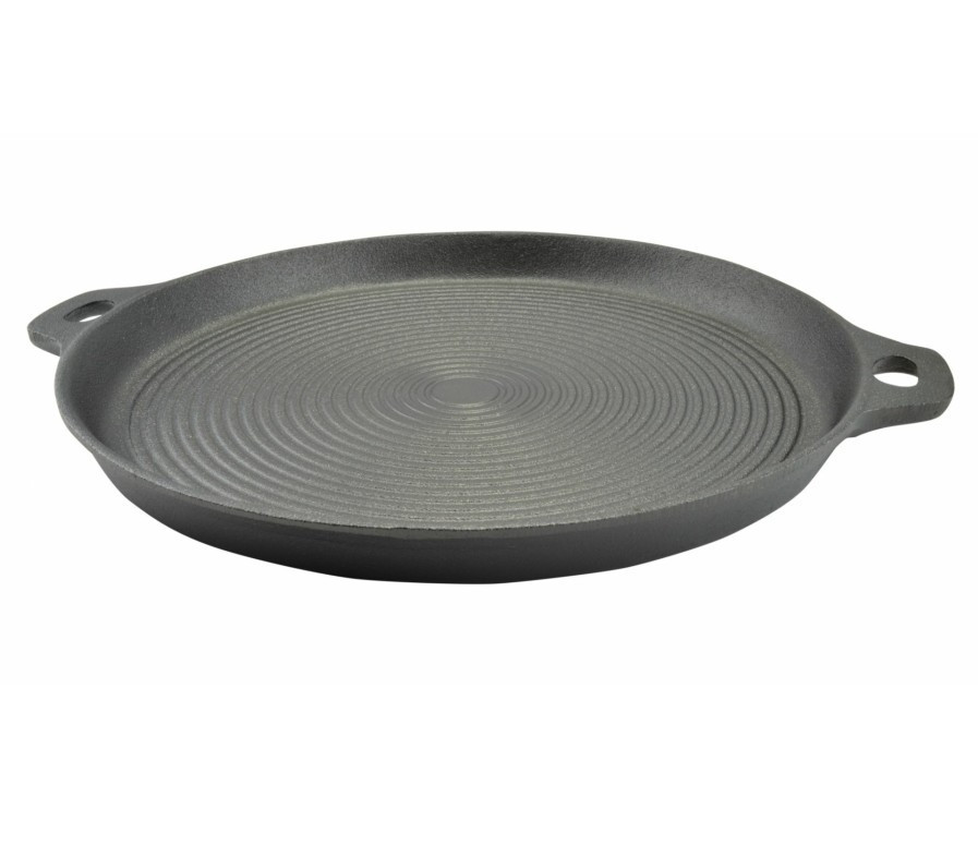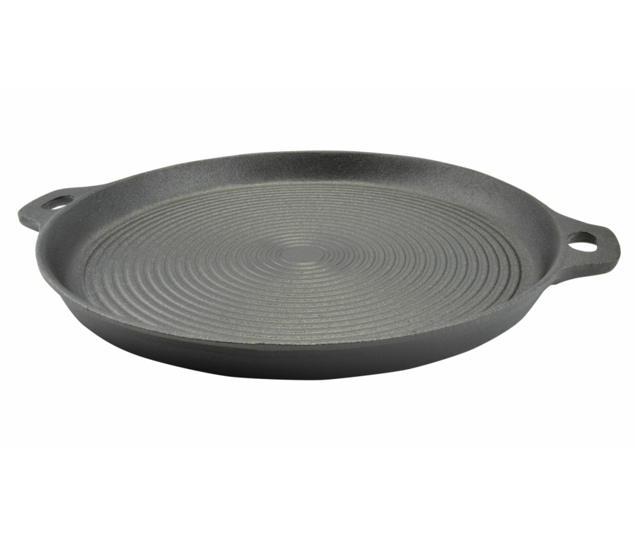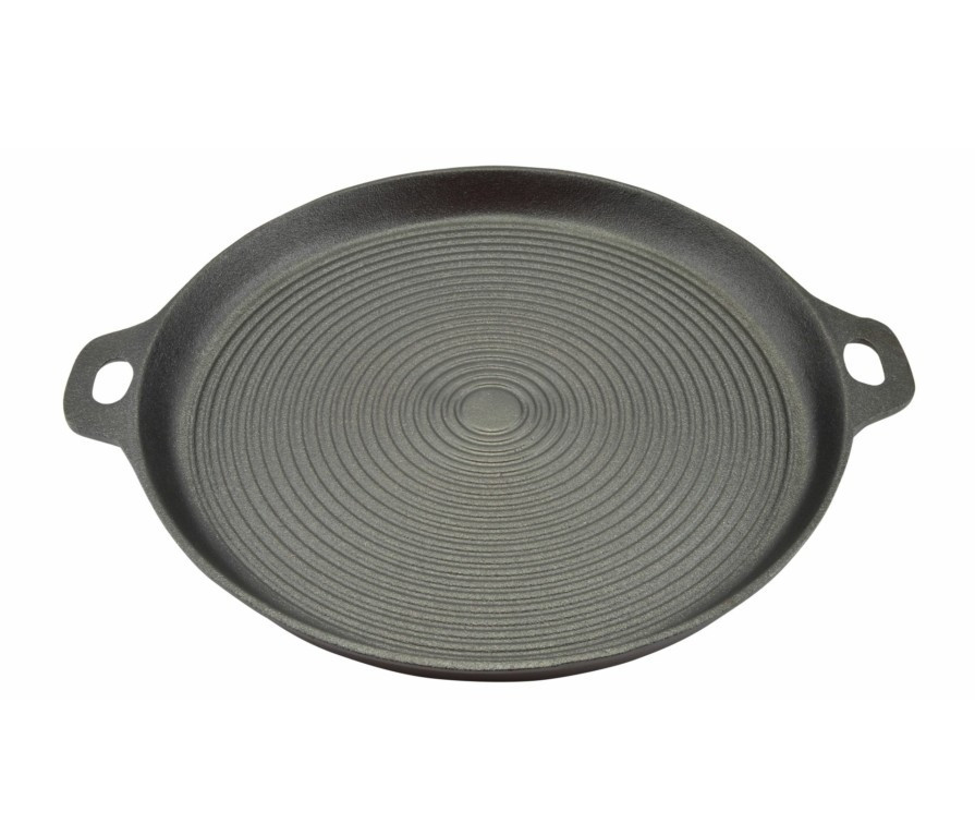 A temék tulajdonságai: - Anyaga: öntöttvas - Mérete: 34 cm átmérőjű; 41 cm széles a fülekkel együtt; 3 cm magas - Bruttó súlya: 3,52 kg - Nettó súlya: 3,3 kg - Használható: szabad tűzön, gáz- illetve elektromos tűzhelyen - sütőben, parázson, kemencében (használjon sütőkesztyűt!) - Tisztítása: Első használat előtt a grill lapról távolítsd el a rozsdásodást gátló növényi olajat. Ehhez a lapot forró vízben, semleges folyékony mosogatószerrel mosd el, alaposan töröld szárazra, ezután kend ki zsirral vagy szalonnával és alaposan hevítsd fel. MInden használat után meleg mosógatószeres vizzel mosd el, alaposan szárítsd meg és kend be zsírral a rozsdásodás elkerülése érdekében.