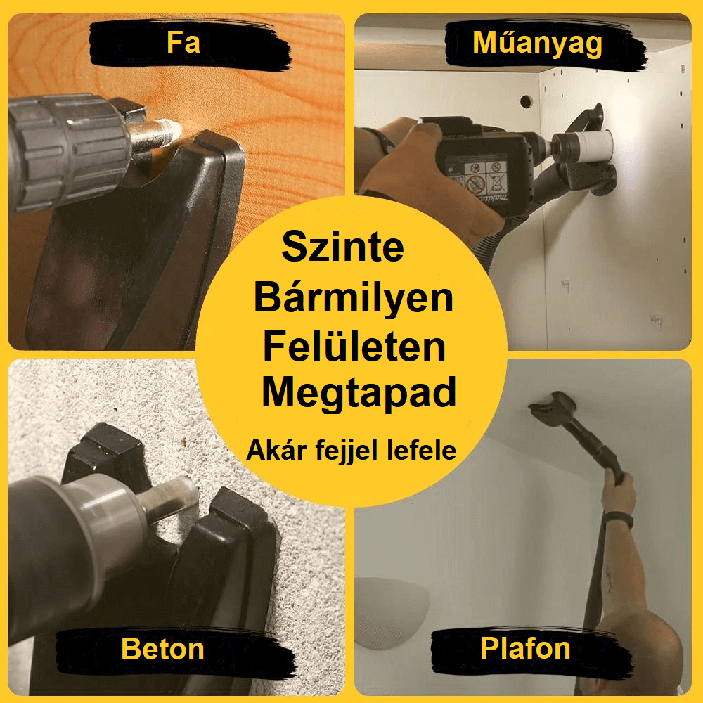 Kéz nélküli porelszívó megoldás fúráshoz. Szinte minden tömlőporszívóhoz illeszkedik. Működik vezetékes és vezeték nélküli porszívókkal is. Szinte bármilyen falfelületen megtapad. Minden típusú fúróval működik. Minimalizálja a levegőben szálló veszélyes szennyeződéseket. Maximalizálja a szívást a fúrófej körül.