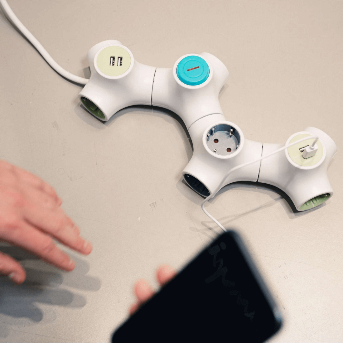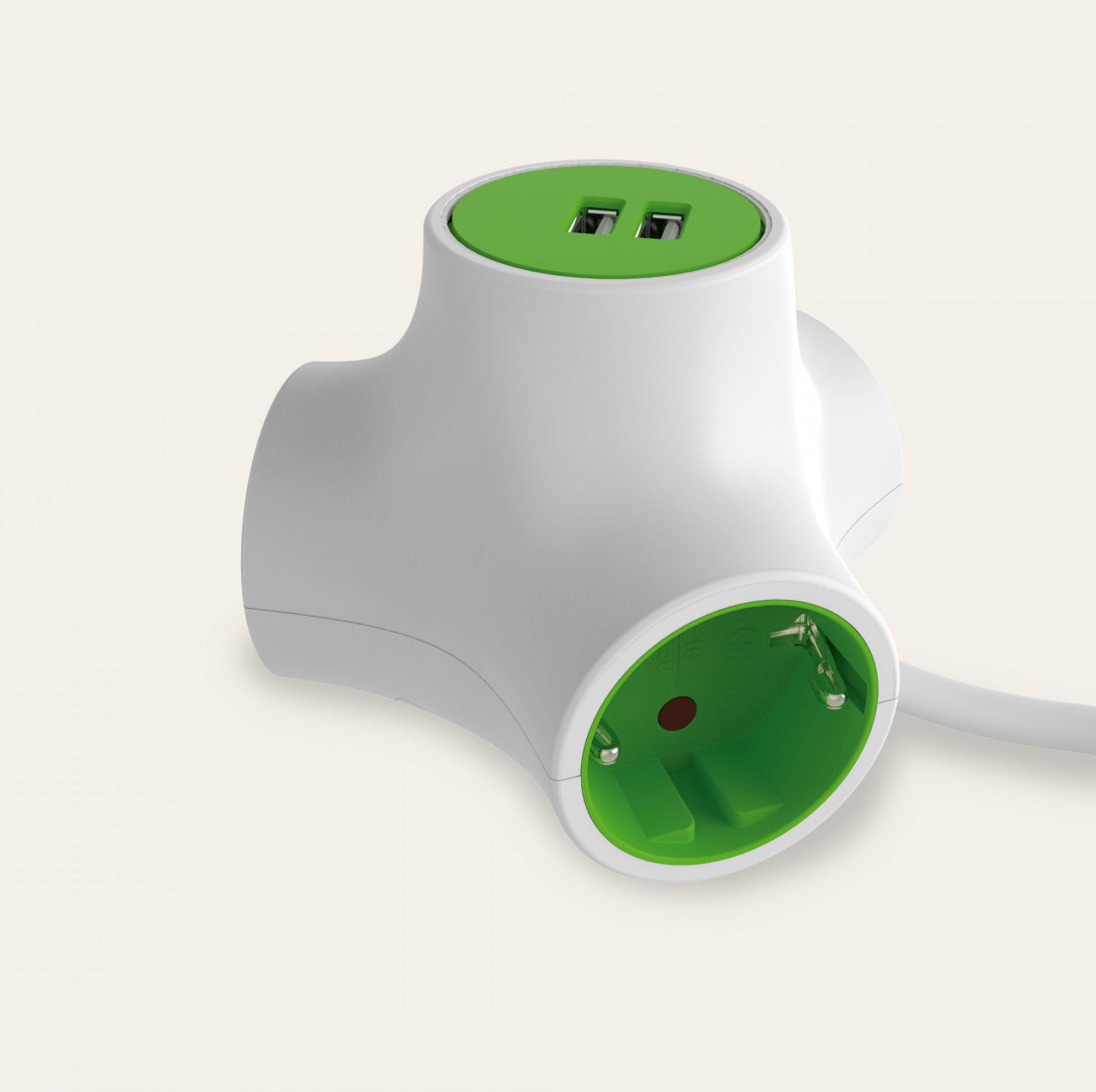 A termék 1,4 méteres kábellel lett ellátva, amelyen található 2 USB port és 3 hálózati csatlakozás. Így egyszerre akár 5 eszközt is bedughatsz az elosztóba. Különlegessége nem csak alakjában van, hanem hogy további ilyen elosztókkal összekapcsolható és így egy „molekuláris” kapcsolatot létrehozni.