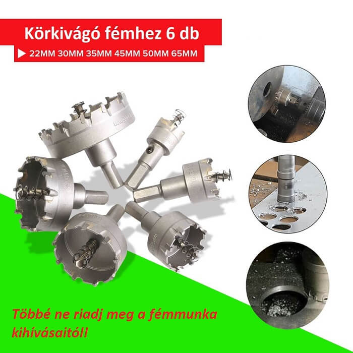 A készletben 6 darab különböző méretű körkivágó található. A lyukfűrészek átmérői: 65mm, 50mm, 45mm, 35mm, 30mm, 22mm. A maximális fúrási mélység mindegyik esetében 9mm.