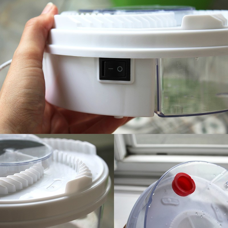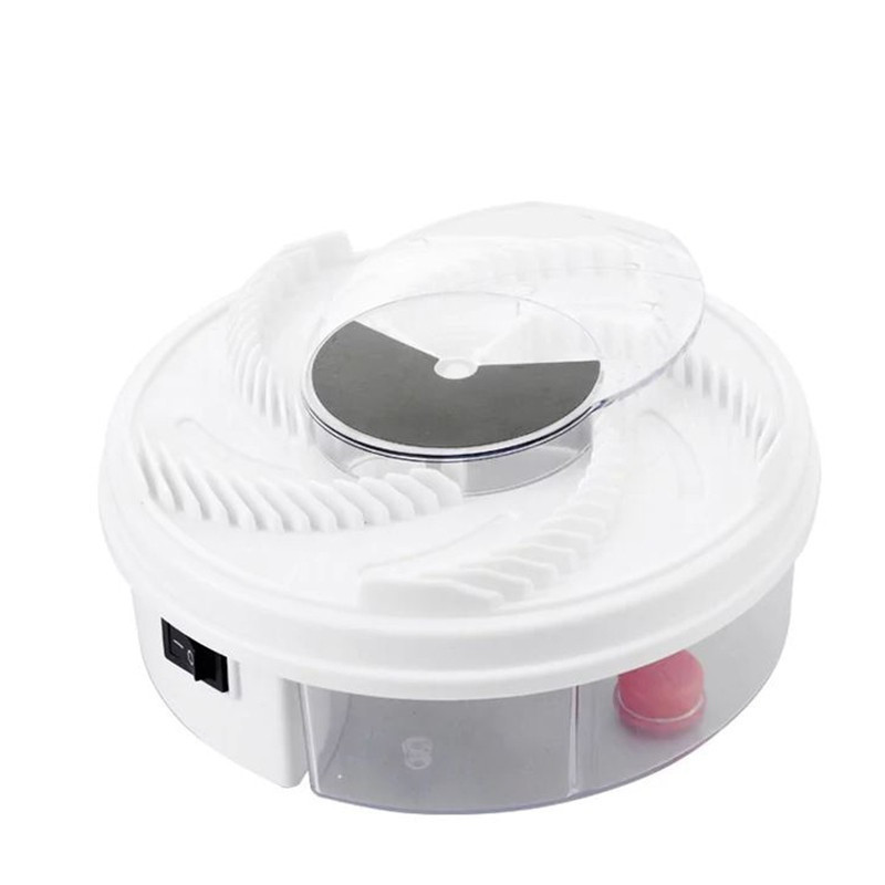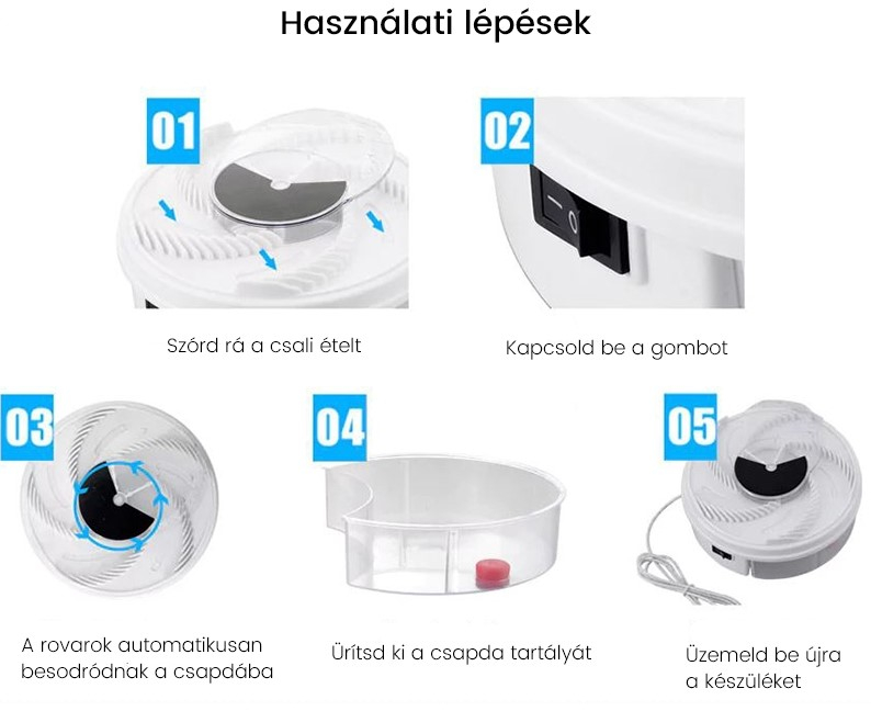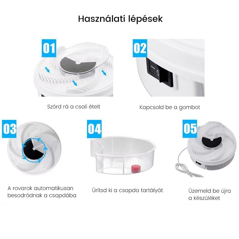 Rakd a csali étket a doboz tetején található csíkszerű lyukakba, majd kapcsold be az oldalán található gombbal, hogy forogni kezdjen. A csali étel odavonzza a rovarokat és folyamatosan tolja be őket a doboz tartályába. Ha megtelt, ürítsd ki és helyezd el újra, ahol szükséges.