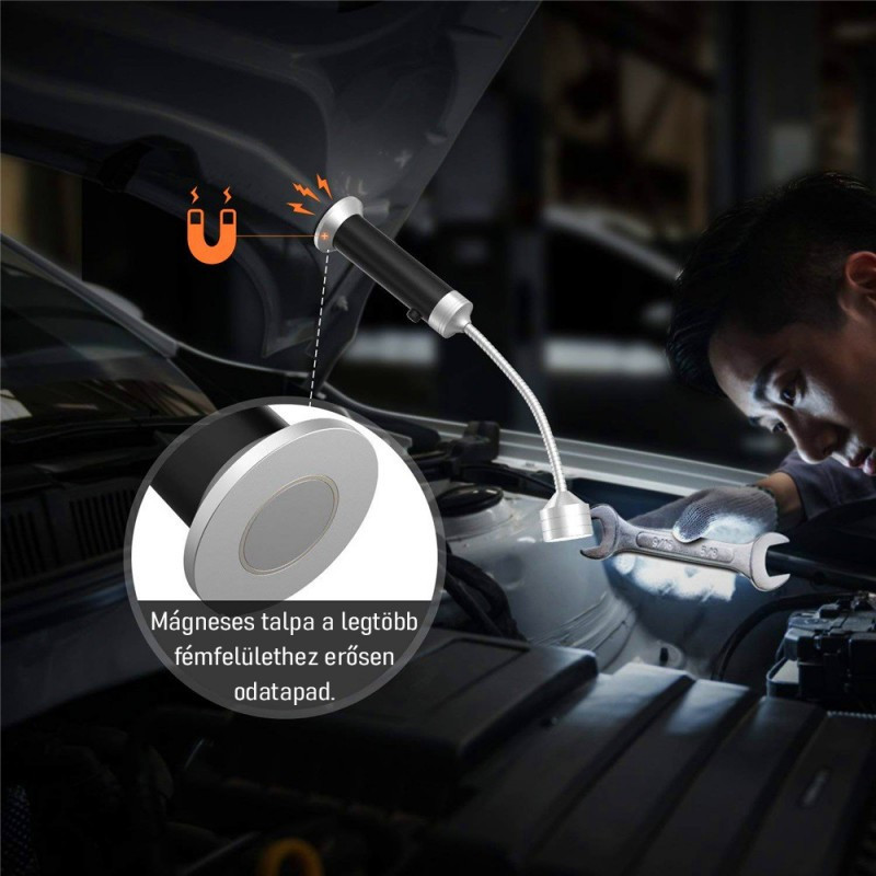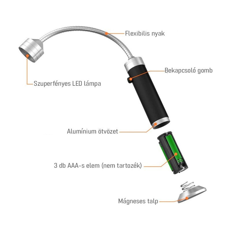 A lámpa vezeték nélküli kialakítású, tehát nem kell bajlódnod a kábelekkel sem, egyszerűen csak 3 darab AAA-s elemeket kell biztosítanod a működéséhez. Ennek köszönhetően rendkívül egyszerűen hordozható és a lehető legtöbb fémfelülethez könnyedén rögzíthető.