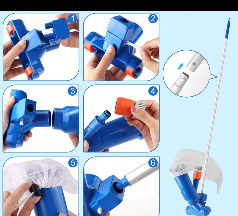 Helyezd a porszívót a medencébe, és nyisd meg a csapot.  A porszívófejben - kialakításának köszönhetően - átfolyó gyors vízáramlástól szívóhatás keletkezik, így a medence alján lévő kosz elkezd felfele áramlani a hálóba.