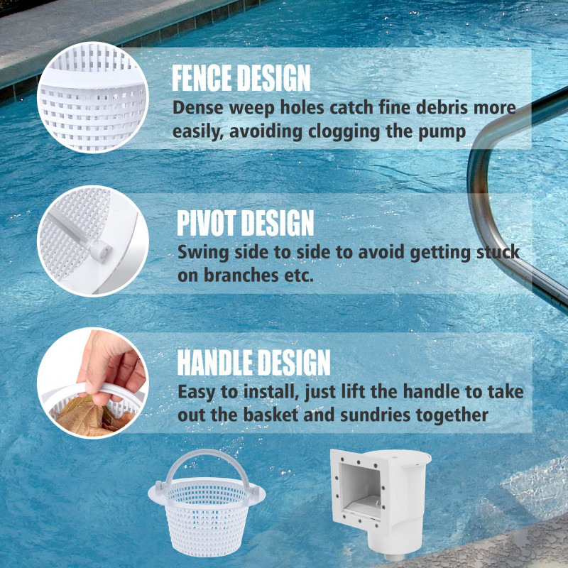 Ez a medence szűrőkosár kis méretű és kompatibilis a falra szerelhető skimmerekkel. Ideális választás a medence szennyeződéseinek kitakarítására.