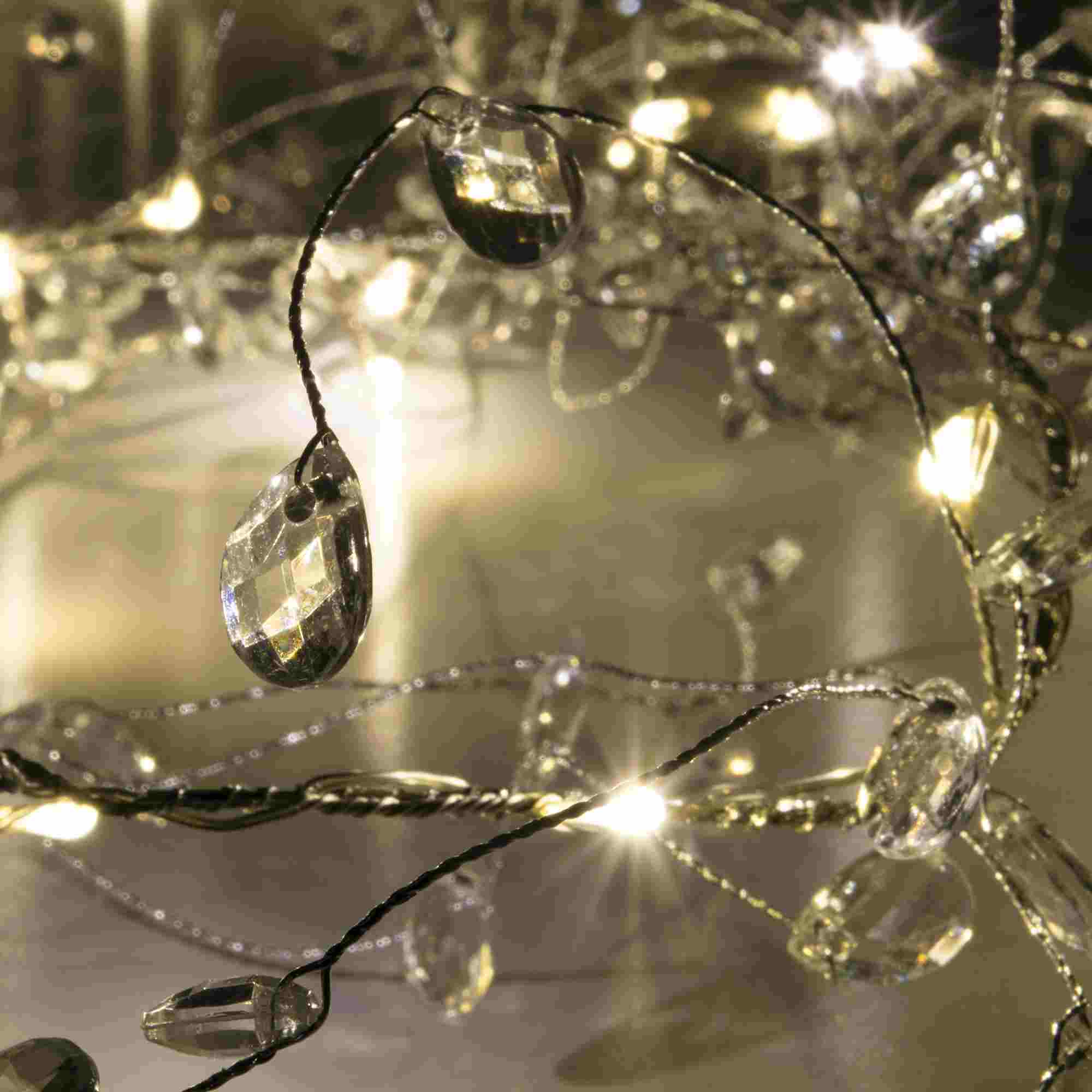 A füzéren akril gyöngy dekorációk találhatóak. A terméket beltéri használatra tervezték, tápellátását 3 db 1,5 V-os AA elem biztosítja. A füzér hossza 1,5 méter, melynek a vezetéke átlátszó színű, így minden dekorhoz tökéletesen passzol. A rajta található Ki/Be kapcsoló gombbal szabályozhatod a működését.