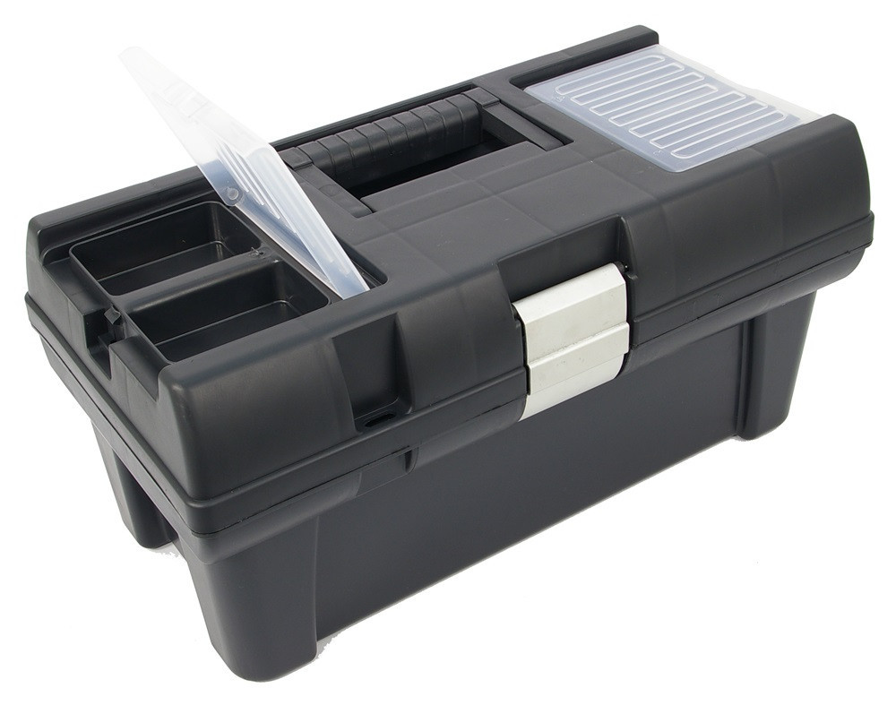 Az oldalak mentén a láda tetején két darab két rekeszes tároló is található, amiben a kisebb eszközöket, legfontosabb csavarokat, szögeket vagy bit hegyeket tárolhatjuk. Belsejében egy kivehető tálca található.