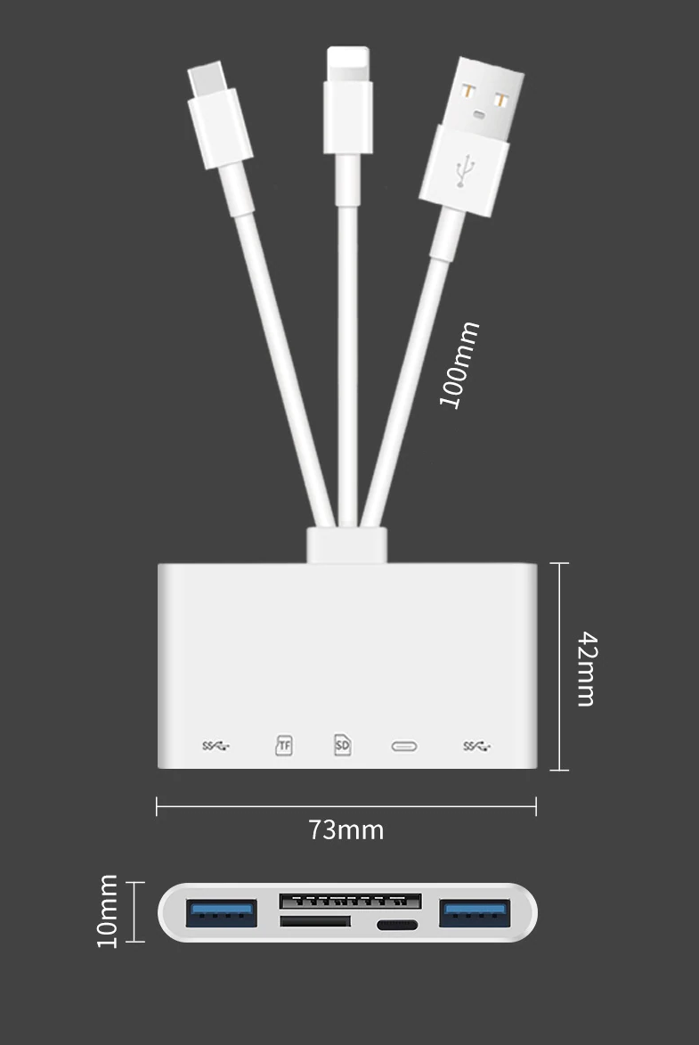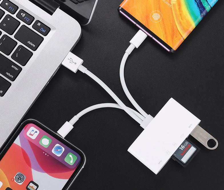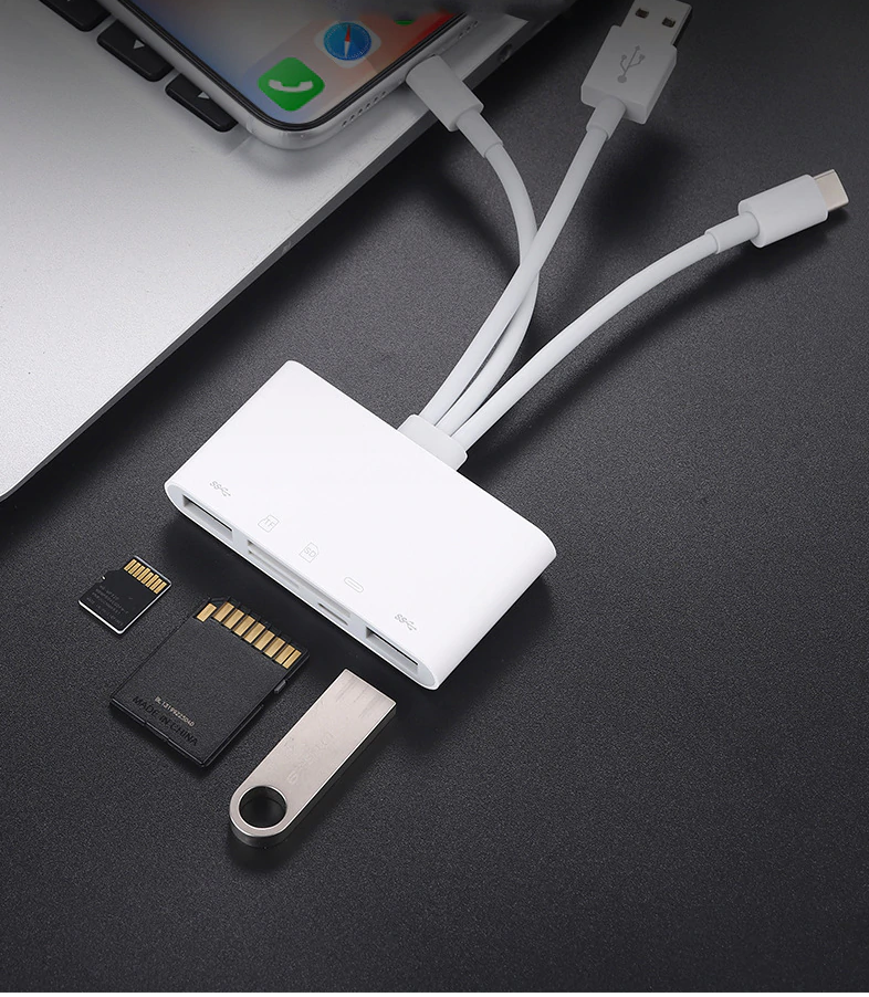 Multifunkcionális kártyaolvasó háromféle USB adatkábellel, adatátvitelhez és eszközök csatlakoztatásához