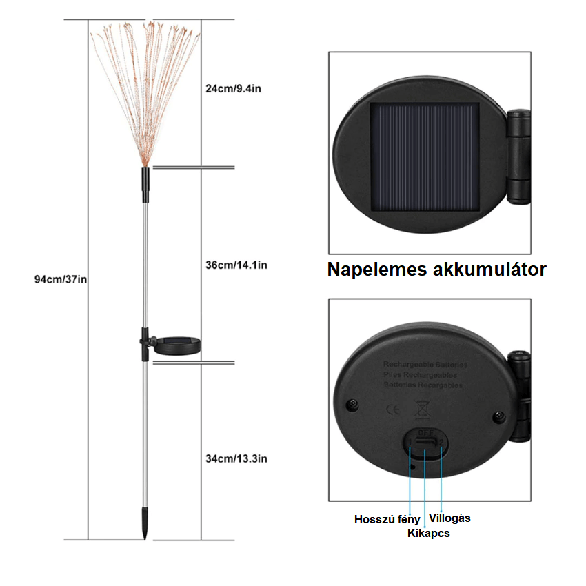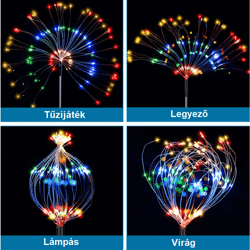 Erős LED-el ellátott lámpa, amelynek minden szálán található egy LED (összesen 90 db). A szálakat többféle képpen elrendezheted, hogy minél egyedibb és különlegesebb formákat kihozz belőlük. Néhány példa: lámpás, virág, legyező stb. A termék napelemes akkumulátorral rendelkezik, így nem igényel hálózati tápellátást. Helyezd a kertben bárhová ahol fény éri, anélkül, hogy aggódnod kellene a kábelezés miatt. A kütyü napnyugtakor automatikusan bekapcsol, napkeltekor pedig ki. Erős, strapabíró házzal rendelkezik, így a zord időjárás sem okoz neki gondot.