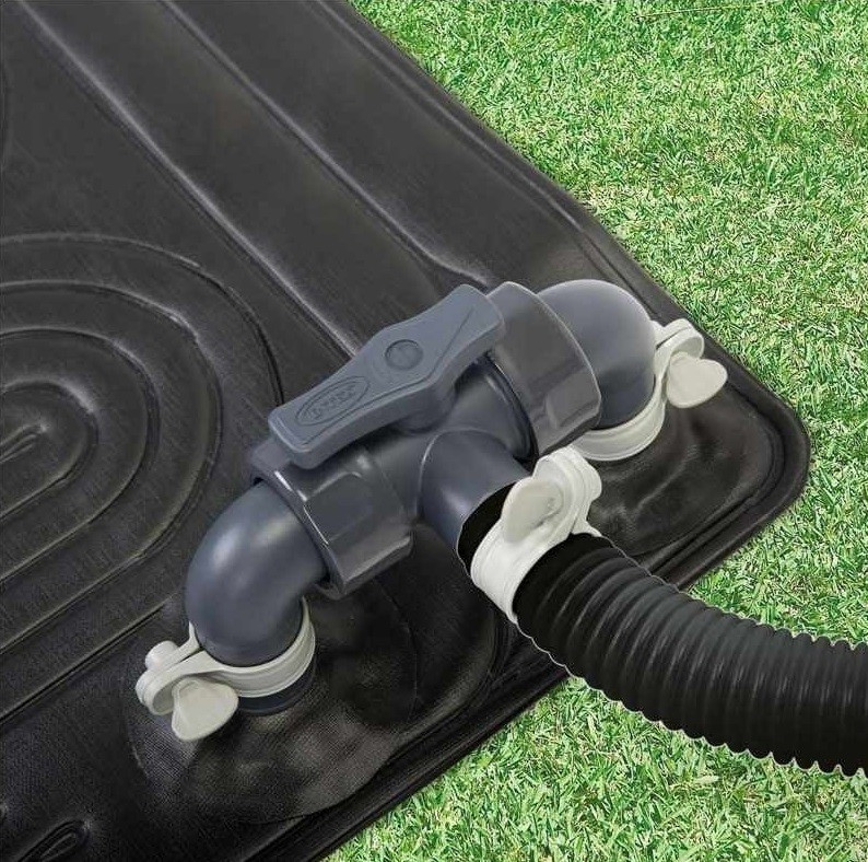 1 db INTEX szolárszőnyeg, napenergiás medence fűtés, 1 db 32 mm-es tömlő és hozzátartozó adapter, 1 db 50 cm hosszú 32 mm átmérőjű gégecső, 1 db bypass szelep