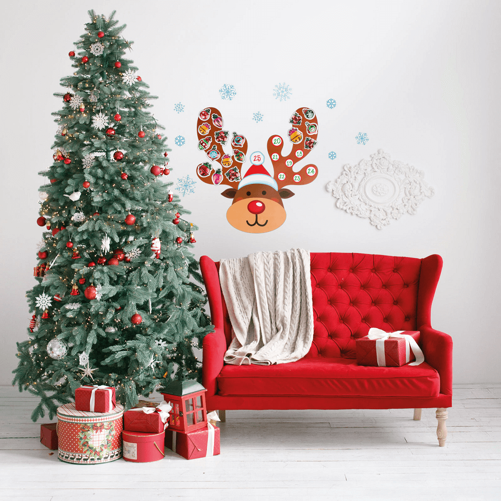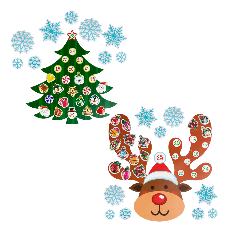 A csomag tartalma 1 rénszarvas vagy karácsonyfa, 25 darab takaró motívum és 9 darab dísz hópehely. Számold vissza a napokat karácsonyig könnyedén és mókásan ennek az adventi naptárnak a segítségével. Minden napra jut egy egyedi „takaró” motívum, amellyel számon tarthatod a hátralévő napokat. A termék egyszerűen applikálható öntapadós technológiájának köszönhetően. Felszerelhető falra és ablakra is egyaránt.