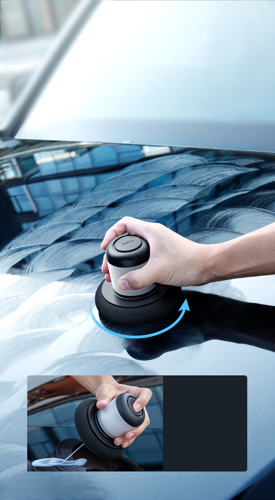 Hasznos infók: A polírozó szivacs könnyedén eltávolítható, ezáltal tisztítható és cserélhető. A polírozógél adagolója a kütyü tartályának alján helyezkedik el, emiatt a kütyün lévő gomb lenyomása -a gél folyamatos fogyásával, egy bizonyos idő múlva- nem elegendő a gél kinyomásához. F inoman nyomd le a tartály tetejét, miközben a tartályt és az abban lévő folyékony autóviasz a polírozandó felület irányába, lefelé fordítod.