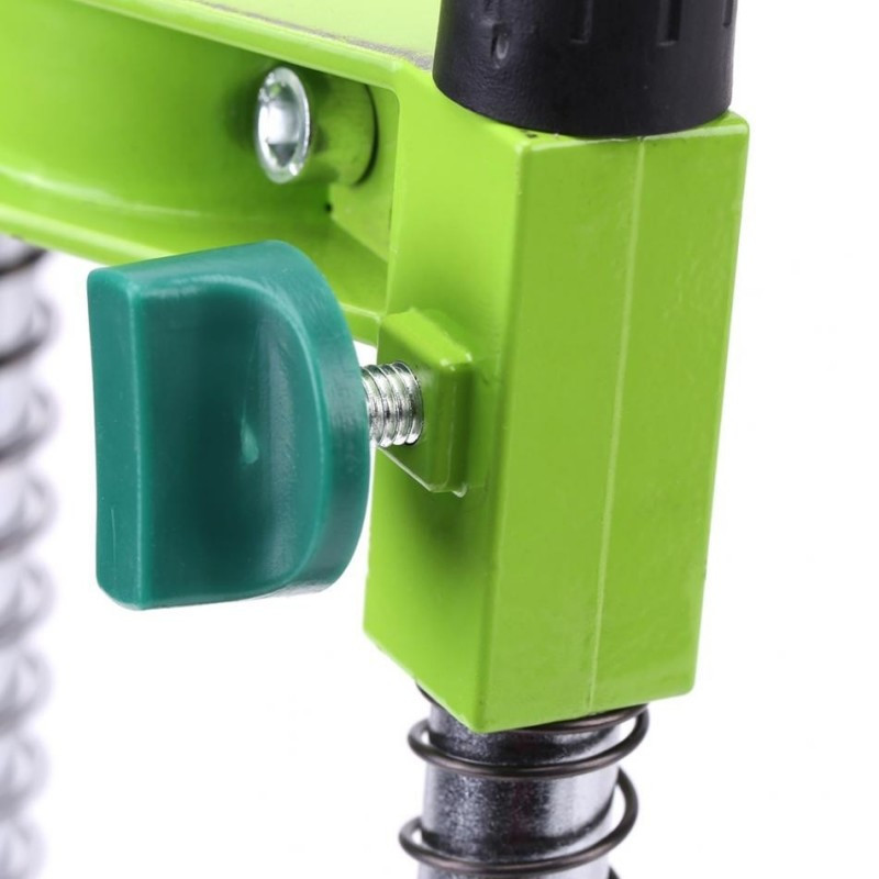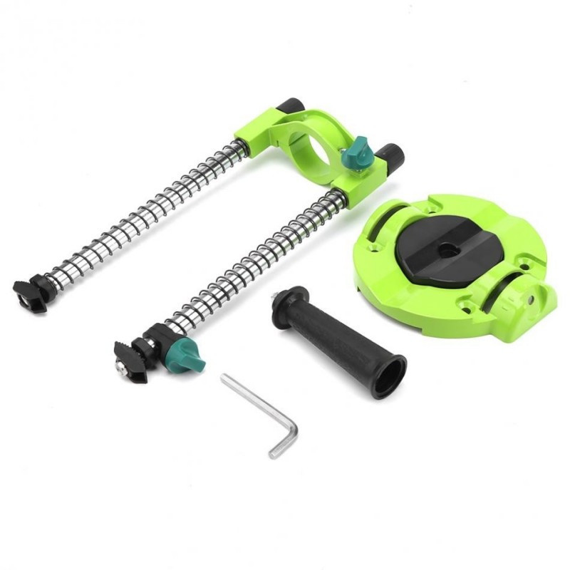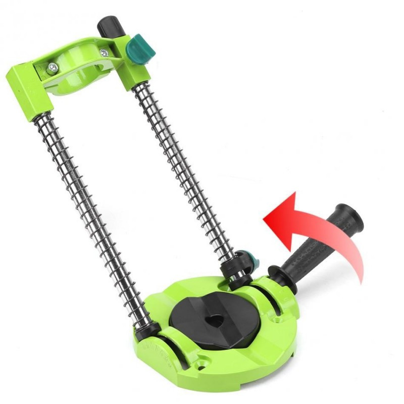 A fúrót 90 fokban döntheted benne, hogy megtaláld a legmegfelelőbb pozíciót. Talapzata úgy lett kialakítva, hogy ha szeretnéd, azt le is rögzítheted, így csak a fúrásra kell odafigyelned. Rugónak köszönhetően, ha kész a furat a kütyü visszaáll az alaphelyzetbe, továbbá segíti az egyenletes fúrást is. Csak standart 43mm-es fúrókkal kompatibilis.