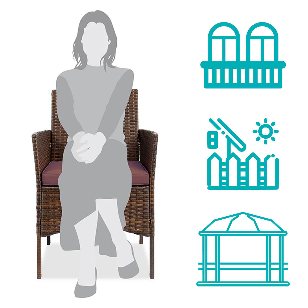 3 részes ülőgarnitúra teraszra, udvarra, kerti kiülőbe. Remek megoldás kisebb teraszokra, erkélyekre, hiszen a 2 ergonómikus szék mellé egy pici, de nagyon praktikus kialakítású asztal társul. Az asztal üveglappal rendelkezik ami védi azt a kiömlő folyadékoktól, illetve stabil felületet teremt. A székek széles háttámlával és karfával rendelkeznek, mindemellett vastag ülőpárnák szolgálják a kényelmet. Modern, fonott felülete dekoratív és strapabíró. A párnák huzata levehető.