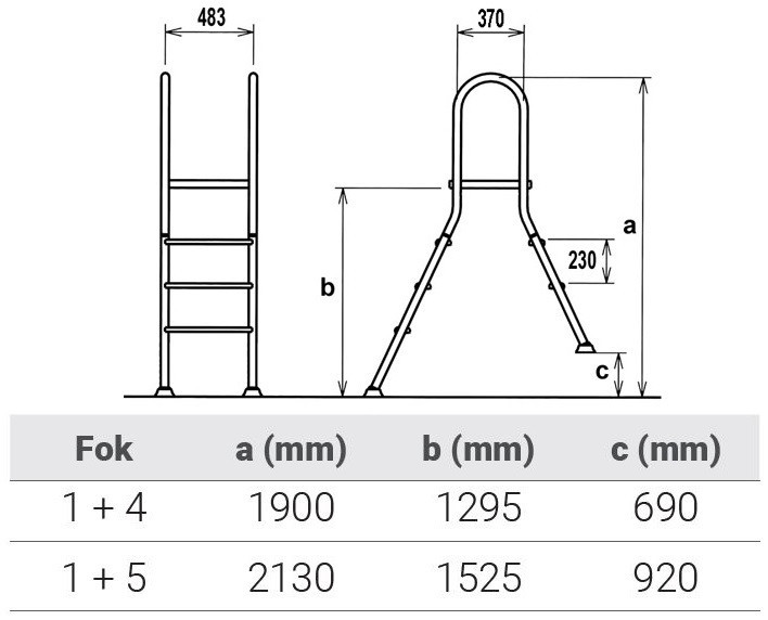 A létra méretei a következők: "a" hossza 2130 mm, "b" hossza 1525 mm, "c" hossza 920 mm. Az ajánlott medence mélység 150 cm, a két ív közötti távolság pedig 483 mm.
